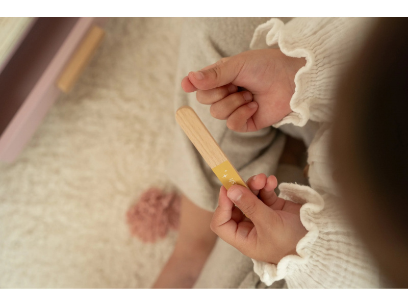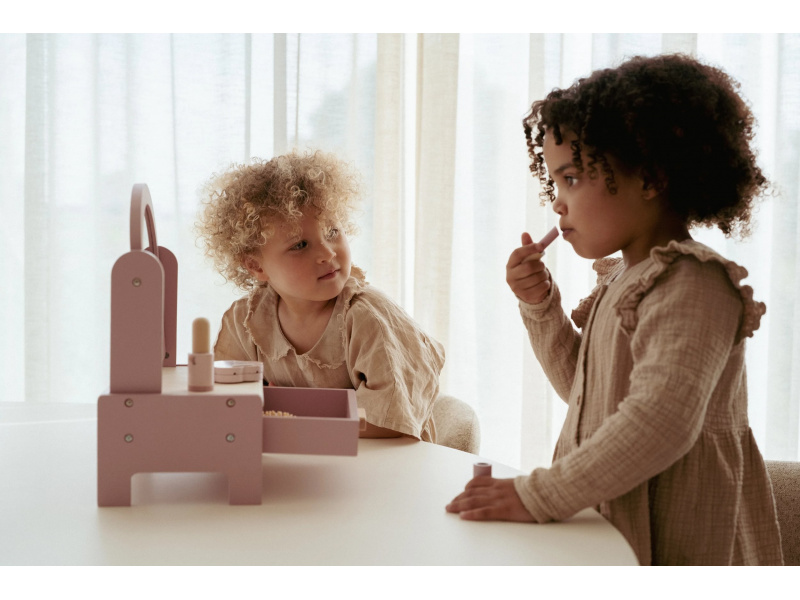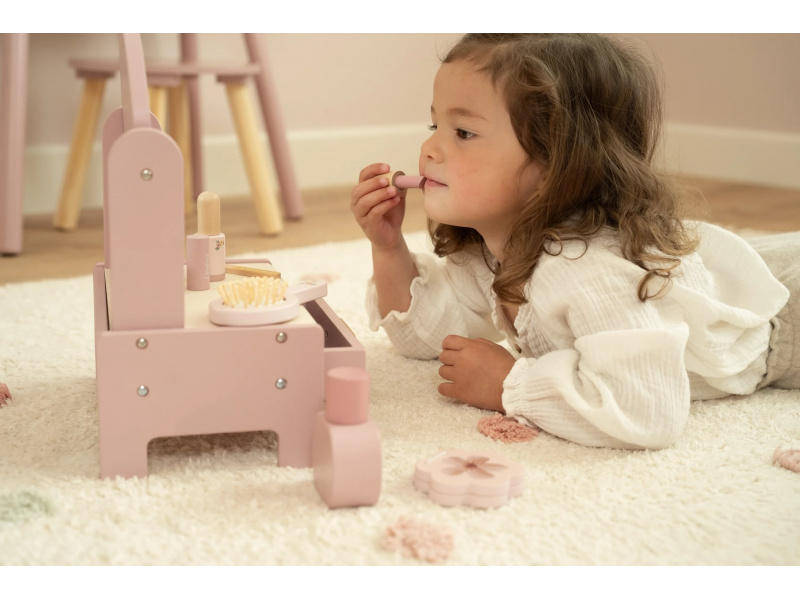 Toaletní stolek s doplňky v dřevěném provedení potěší malou parádnici a stane se i krásnou dekorací v dětském pokoji. Stolek je vybaven otočným zrcadlem, kartáčem na vlasy, parfémem, rtěnkou, očními stíny, pilníkem a lakem na nehty. Zásuvka je ideální pro uložení drobností. Stolek je součástí kolekce vysoce kvalitních dřevěných hraček Little Dutch, navržených s důrazem na bezpečnost a originální design. Vyrobeno z odolného FSC certifikovaného dřeva. Rozměry: 33 x 26,6 x 17,4 cm Vhodné pro děti od 3 let.