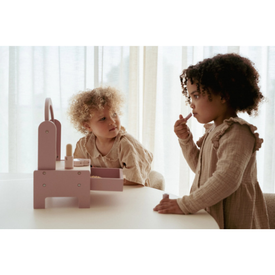 Toaletní stolek s doplňky v dřevěném provedení potěší malou parádnici a stane se i krásnou dekorací v dětském pokoji. Stolek je vybaven otočným zrcadlem, kartáčem na vlasy, parfémem, rtěnkou, očními stíny, pilníkem a lakem na nehty. Zásuvka je ideální pro uložení drobností. Stolek je součástí kolekce vysoce kvalitních dřevěných hraček Little Dutch, navržených s důrazem na bezpečnost a originální design. Vyrobeno z odolného FSC certifikovaného dřeva. Rozměry: 33 x 26,6 x 17,4 cm Vhodné pro děti od 3 let.