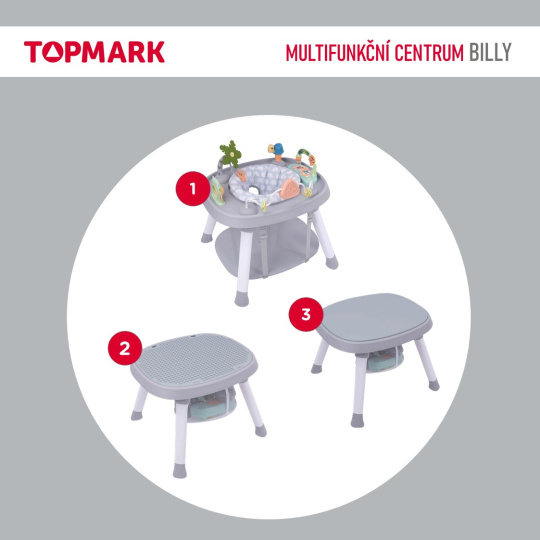 Hrací centrum lze po vyjmutí hraček přeměnit v praktický hrací nebo pracovní stoleček, stačí si jen zvolit vybranou stranu pracovní desky (hladkou nebo herní).