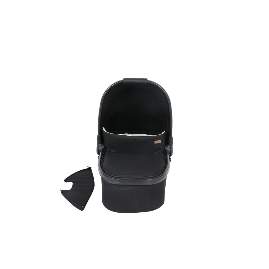 Korbička má hliníkový rám s černou úpravou, 3-dílnou prostornou boudu se slunečným kšiltem.