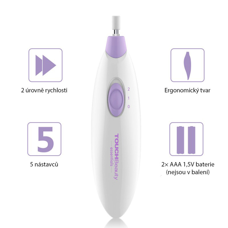 - Souprava s 5 nástavci - čistí, opravuje, tvaruje, ostří, brousí, leští nehty, odstraňuje mozoly.