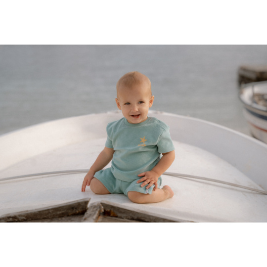 Tričko a kraťasy z příjemného bavlněného froté materiálu jsou ideální pro teplé letní dny na pláži, zahradě i na výletech a procházkách. Složení: 100% organická bavlna Možno prát v pračce na 30°C.