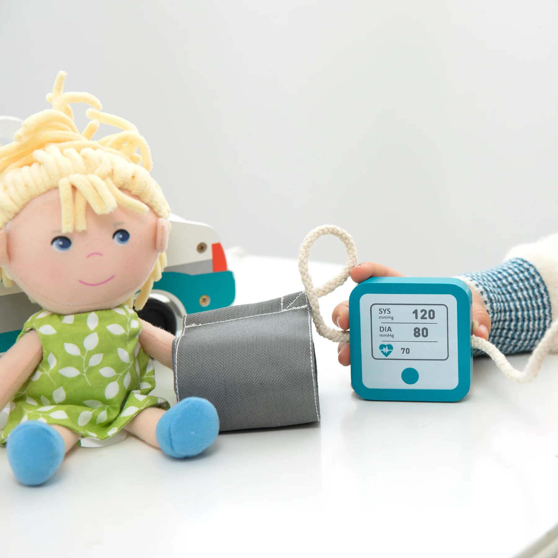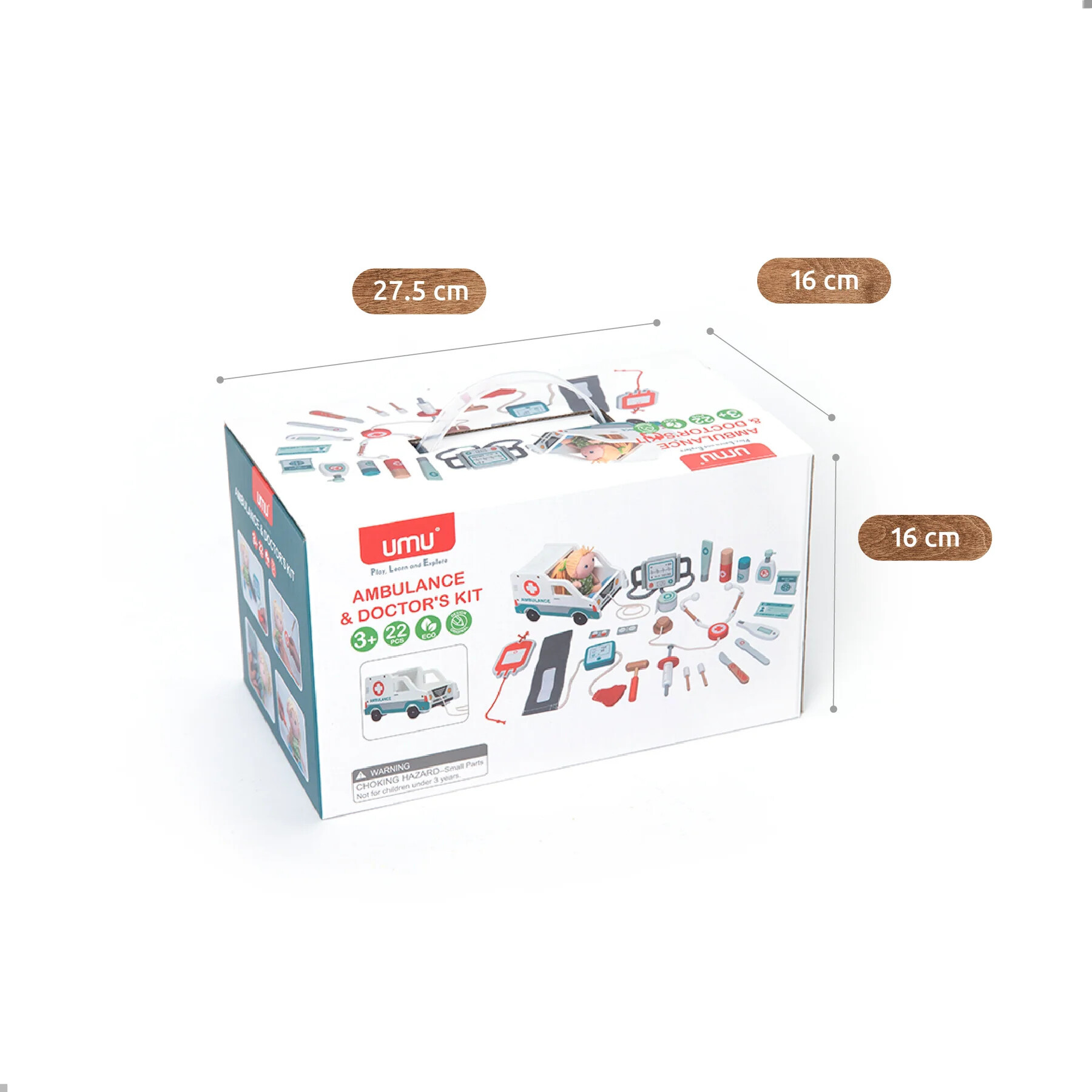 Tato dřevěná hrací sada obsahuje: 1.) defibrilátor, 2. sanitku, 3. mast, 4. kleště na jazyk, 5. teploměr, 6. mýdlo na ruce, 7. lahvičku s léky, 8. voděodolnou pásku, 9. ledový obklad, 10. vatové tampony, 11. lékařský balíček. 11. vatový tampon, 12. průkaz pacienta, 13. tlakoměr, 14. figurína, 15. stetoskop, 16. krevní vak, 17. injekční stříkačka, 18. chirurgický nůž, 19. kladívko, 20. lékařský sprej, 21. tablety, 22. tablety.