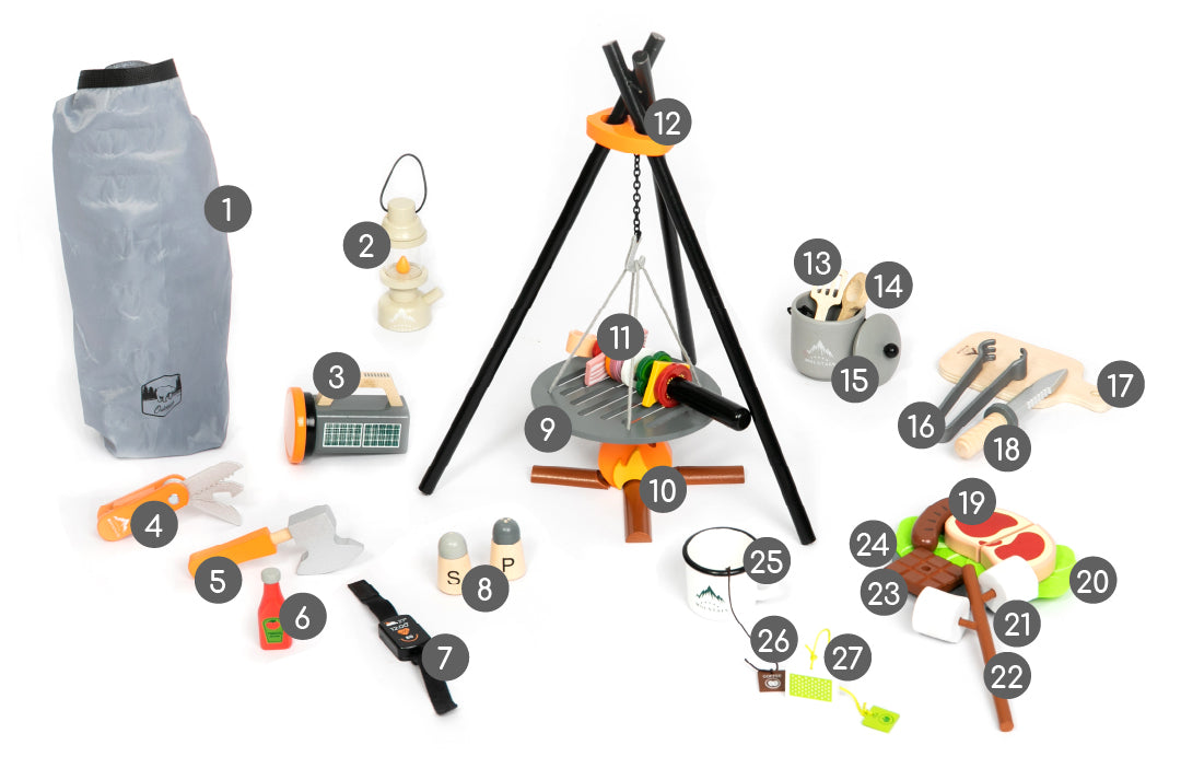 Tato dřevěná hrací sada obsahuje: 1.) Batoh, 2.) Lampu, 3.) Baterku, 4.) Kapesní nůž, 5.) Sekeru, 6.) Kečup, 7.) Chytré hodinky, 8.) Sůl a pepř, 9.) Gril, 10.) Ohniště, 11.) Špíz, 12.) Stojan na grilování, 13.) Dřevěné hračky. ) Špachtle, 14.) Lžíce, 15.) Závěsný hrnec, 16.) Kleště na grilování, 17.) Prkénko na krájení, 18.) Nůž, 19.) Steak a klobása, 20.) 2x Salát, 21.) 2x Marshmallow, 22.) Tyčinka, 23.) Čokoláda, 24.) Talíř, 25.) Plechový hrnek, 26.) Káva, 27.) Čaj.