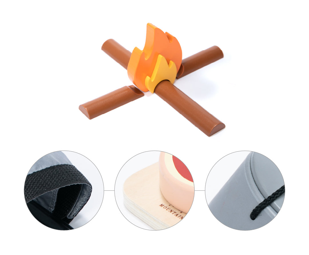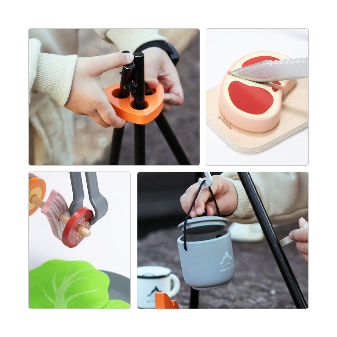 Hrací sada je tak realistická, že se vaše dítě může okamžitě vydat na dobrodružnou výpravu do přírody s veškerým vybavením. Sada se skládá ze skutečně funkčních předmětů - vztyčitelná trojnožka nad ohništěm, závěsný pekáč s pokličkou, ve kterém se dá "vařit", multifunkční kapesní nůž, maso, které se dá krájet, atd.