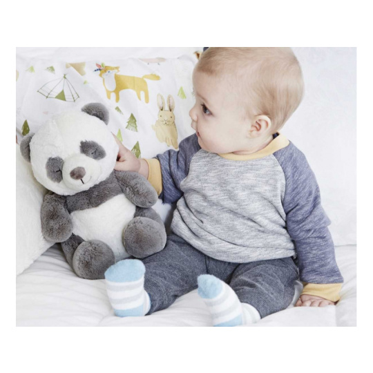 Usínáček v podobě neodolatelného plyšového medvídka pandy s hudbou a relaxačními zvuky pomůže vašemu dítěti uklidnit se a snáze usnout. Hračka nabízí 4 melodie a 4 uklidňující přírodní zvuky (déšť, tlukot srdce, vlny, velrybí píseň). Inteligentní senzor zvuku s nastavitelnou citlivostí aktivuje přehrávání melodie, když dítě začne plakat. Hudební box nabízí možnost nastavení hlasitosti a automatického vypnutí po 23 nebo 45 minutách. Usínáčka můžete snadno zavěsit na postýlku dítěte, postavit na noční stolek či položit do postýlky. Vyjímatelný hudební box se světlem je možné používat i samostatně mimo hračku pandy. Hračku je možné po vyjmutí hudební boxu prát v pračce. Baterie 2xAA jsou součástí balení. Rozměry: 26 x 16 x 10 cm Vhodné pro děti od narození.