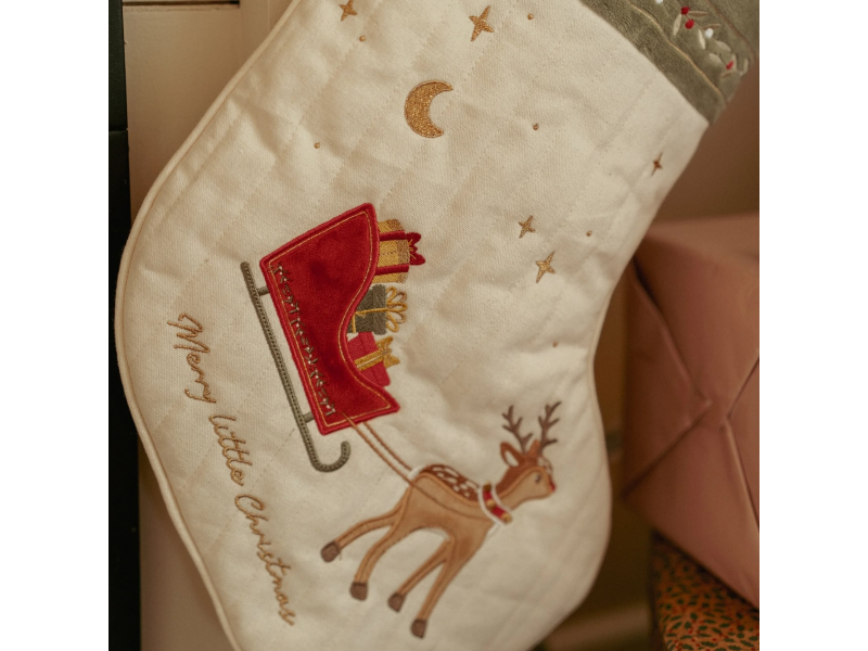 Vneste do svého domova teplo a kouzlo Vánoc s touto krásnou vánoční punčochou z měkké, prošívané látky. Je ozdobena jemnou výšivkou s motivem soba, saní s dárky a třpytivých hvězd. Díky svému nadčasovému designu v přírodních barvách skvěle ladí s klidnou a tradiční vánoční výzdobou. Punčochu lze zavěsit na krb, dveře či postel a naplnit drobnými dárky, sladkostmi nebo vzkazy pro blízké. Každý rok se tak stane oblíbenou součástí rodinných Vánoc. Punčocha je součástí speciální vánoční kolekce doplňků a hraček Little Dutch. Rozměry: 52,5 × 29 cm Složení: 95 % bavlna, 5 % polyester; výplň: 100 % polyester