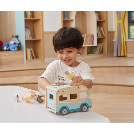 Dřevěný karavan je výjimečná hračka, která děti zavede do světa prázdninových dobrodružství a letních cest! Sada je inspirována bezstarostnými výjezdy k moři a díky precizním detailům a realistickým funkcím — jako jsou posuvné dveře, výsuvná střecha nebo střešní nosič na surfovací prkno — poskytuje dítěti hodiny zábavy plné kreativity. Karavan obsahuje bohaté příslušenství: dvě panenky, pejska, lehátka s polštářky, slunečník, gril, dokonce surfovací prkno, což umožňuje hrát všelijaké scénáře. Děti tak mohou ztvárňovat role týkající se cestování, odpočinku na pláži nebo organizování pikniku.