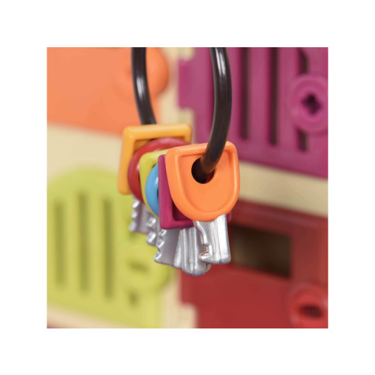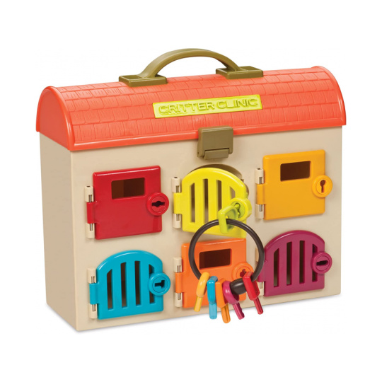 Nemocnice pro zvířátka ve tvaru kufříku má šest pokojů s různobarevnými dvířky a klíčky. Když chce dítě dvířka otevřít, musí vybrat klíček správné barvy. Na léčení jsou připraveni dva plyšoví pacienti – pejsek a kočička. Malý veterinář má k dispozici 5 nástrojů: stetoskop, stříkačku, pinzetu, zrcátko a teploměr. Rozměry: 31 x 12 x 28 cm Vhodné pro děti od 2 let.
