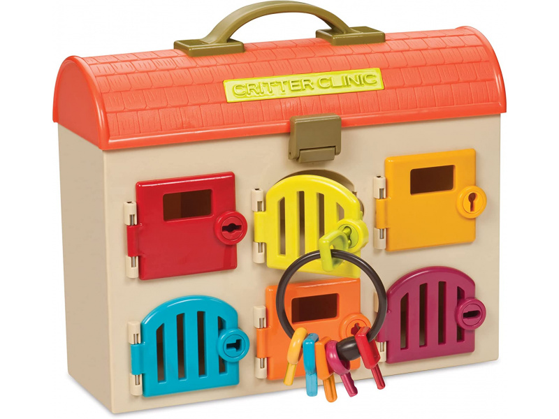 Nemocnice pro zvířátka ve tvaru kufříku má šest pokojů s různobarevnými dvířky a klíčky. Když chce dítě dvířka otevřít, musí vybrat klíček správné barvy. Na léčení jsou připraveni dva plyšoví pacienti – pejsek a kočička. Malý veterinář má k dispozici 5 nástrojů: stetoskop, stříkačku, pinzetu, zrcátko a teploměr. Rozměry: 31 x 12 x 28 cm Vhodné pro děti od 2 let.