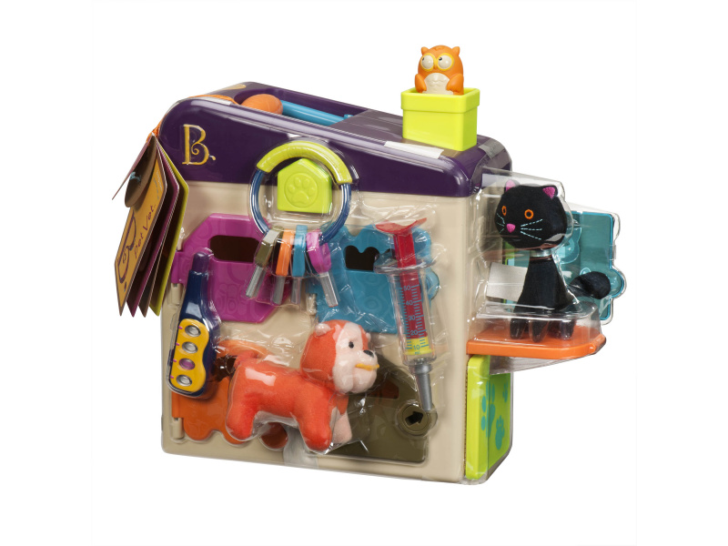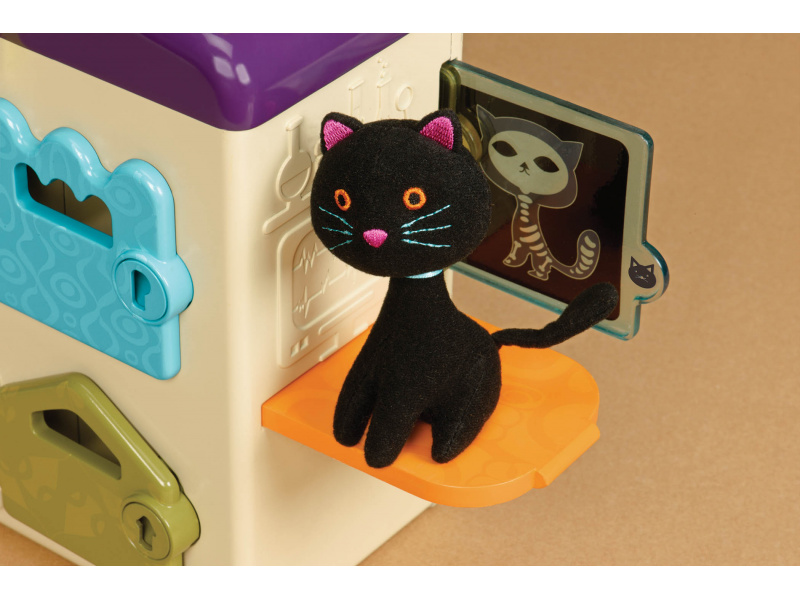 Nemocnice pro zvířátka ve tvaru kufříku má čtyři pokoje s různobarevnými dvířky a klíčky. Když chce dítě dvířka otevřít, musí vybrat klíček správné barvy. Na léčení jsou připraveni dva plyšoví pacienti – pejsek a kočička. Malý veterinář má k dispozici 4 nástroje: stetoskop, stříkačku, váhu a teploměr. Vysunovací pult usnadňuje vyšetřování malých pacientů. Z komína vykukuje sovička. Nepotřebuje baterie. Vhodné pro děti od 2 do 6 let.