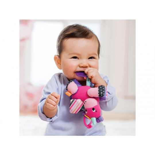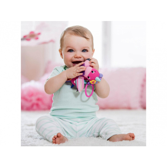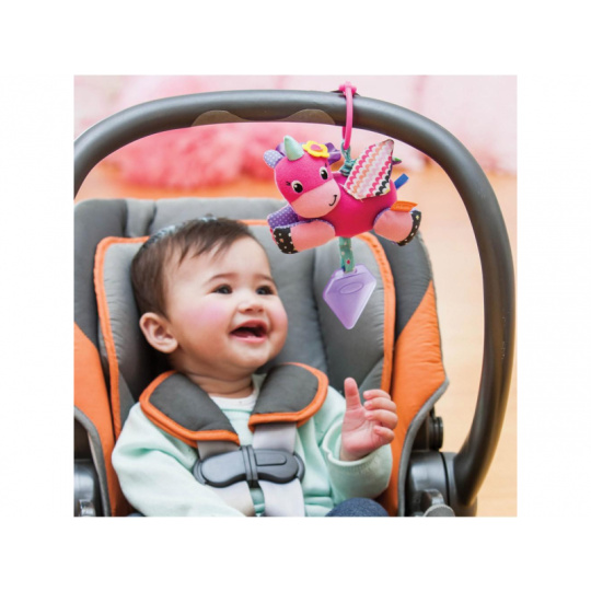 Jednorožec upoutá pozornost dítěte svými výraznými barvami i cinkáním při pohybu. Po zatažení za šňůrku vibruje. Různorodé textury a šustící křídla lákají dítě ke zkoumání. Kousátko pomáhá dítěti při prořezávání prvních zoubků. Hračku je možné zavěsit na autosedačku, kočárek či hrazdu na hrací dece. Vhodné pro děti od narození.