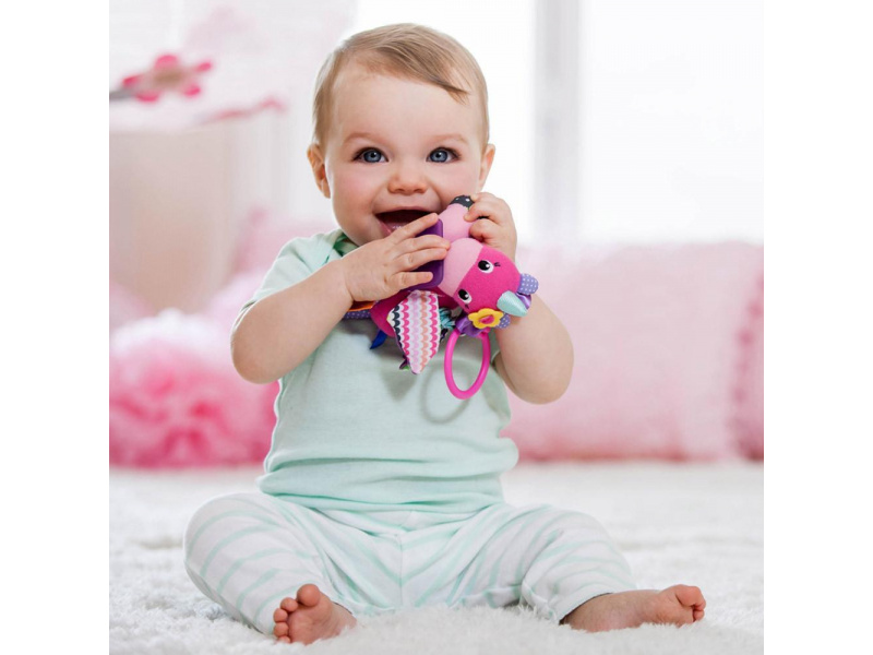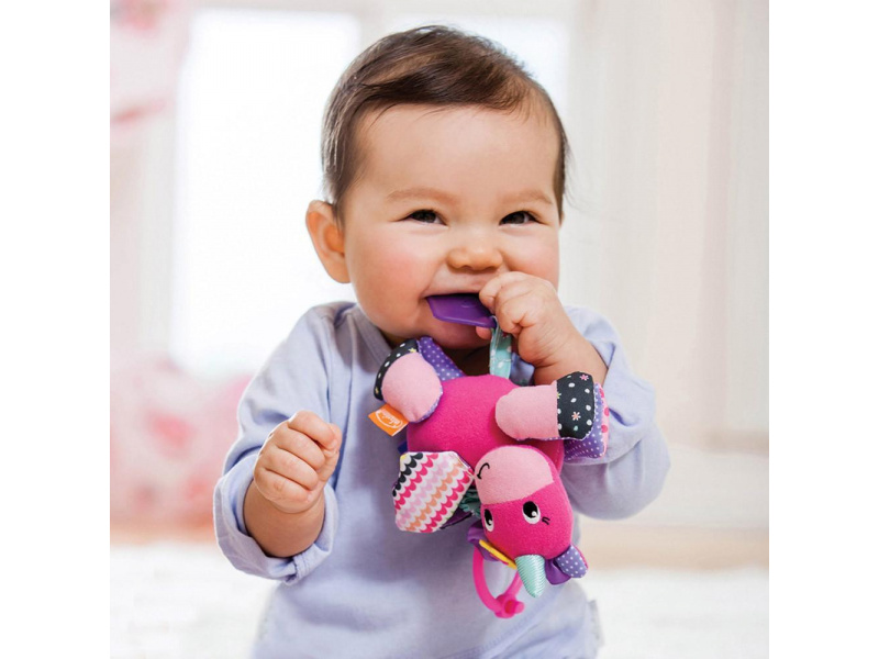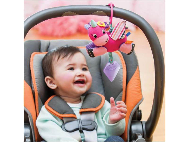 Jednorožec upoutá pozornost dítěte svými výraznými barvami i cinkáním při pohybu. Po zatažení za šňůrku vibruje. Různorodé textury a šustící křídla lákají dítě ke zkoumání. Kousátko pomáhá dítěti při prořezávání prvních zoubků. Hračku je možné zavěsit na autosedačku, kočárek či hrazdu na hrací dece. Vhodné pro děti od narození.