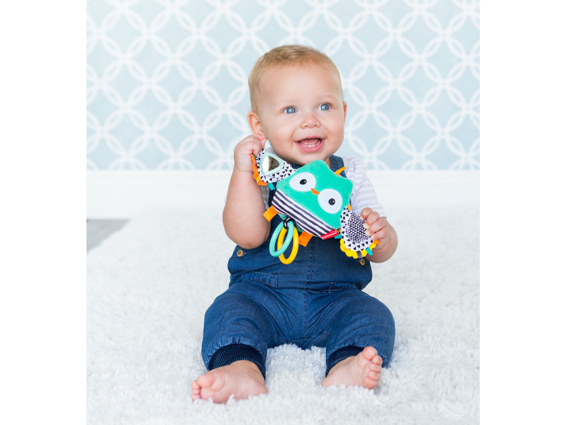 Originální hračka, která zabaví děti i jejich rodiče. Zatáhněte za kroužek a sledujte spolu s dítětem, jak sova vibruje a mává křídly! Pozornost dítěte upoutají i výrazné barvy a různorodé textury ke zkoumání včetně bezpečného zrcátka. Vhodné pro děti od narození.