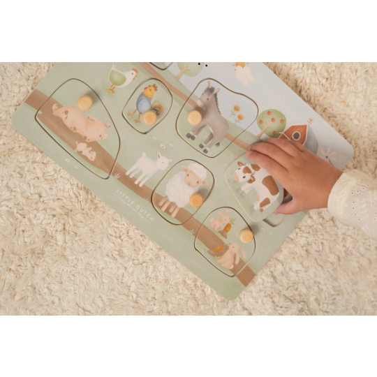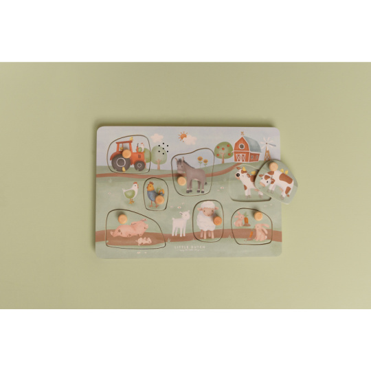 Seznamte vaše dítě se zvířátky z farmy a poznávejte společně, jakými zvuky se dorozumívají. Když dítě vloží správný tvar do otvoru na herní desce, ozve se hlas zvířátka, které je na vkládacím dílu namalované. Puzzle hra v dřevěném provedení s krásnými obrázky nabízí 7 různých vkládacích dílů ve tvaru traktoru a zvířátek s jejich hlasy. Hračka je součástí designové kolekce hraček a doplňků Little Dutch Farma. Vyrobeno z dřeva certifikovaného FSC. Baterie 2xAAA nejsou součástí balení. Rozměry: 21 x 30 x 2,4 cm Vhodné pro děti od 12 měsíců.