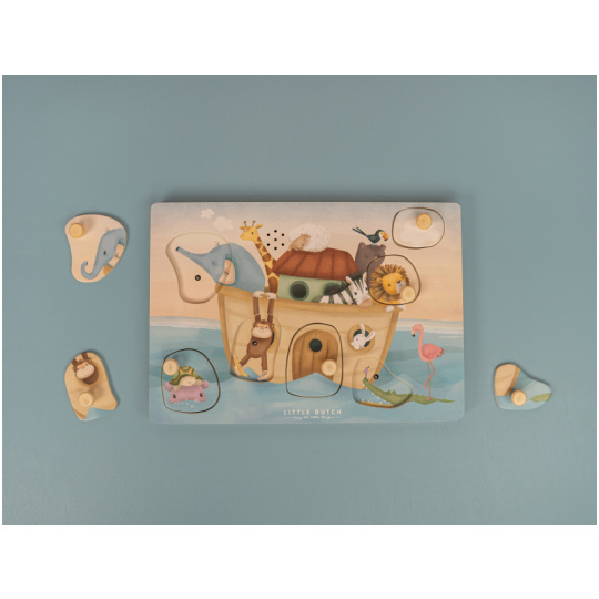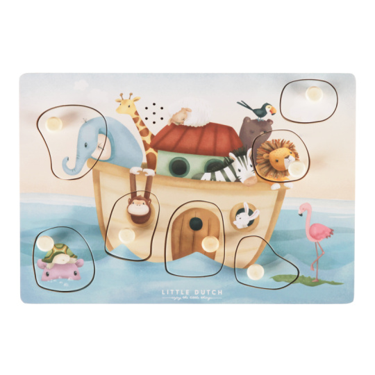 Poznávejte spolu s vaším dítětem, která zvířata plují na Noemově arše a jaké zvuky vydávají. Když dítě vloží správný tvar do otvoru na herní desce, ozve se např. hlas slona či lva nebo bublání pod hladinou. Puzzle hra v dřevěném provedení s krásnými obrázky nabízí 7 různých vkládacích dílů. Rozměry: 21 x 30 x 2,4 cm Baterie 2xAAA nejsou součástí balení. Vhodné pro děti od 12 měsíců.