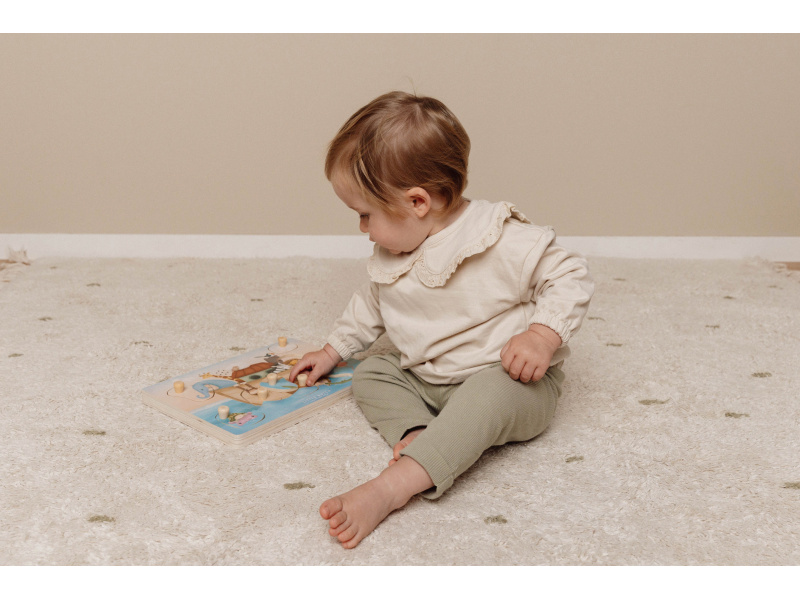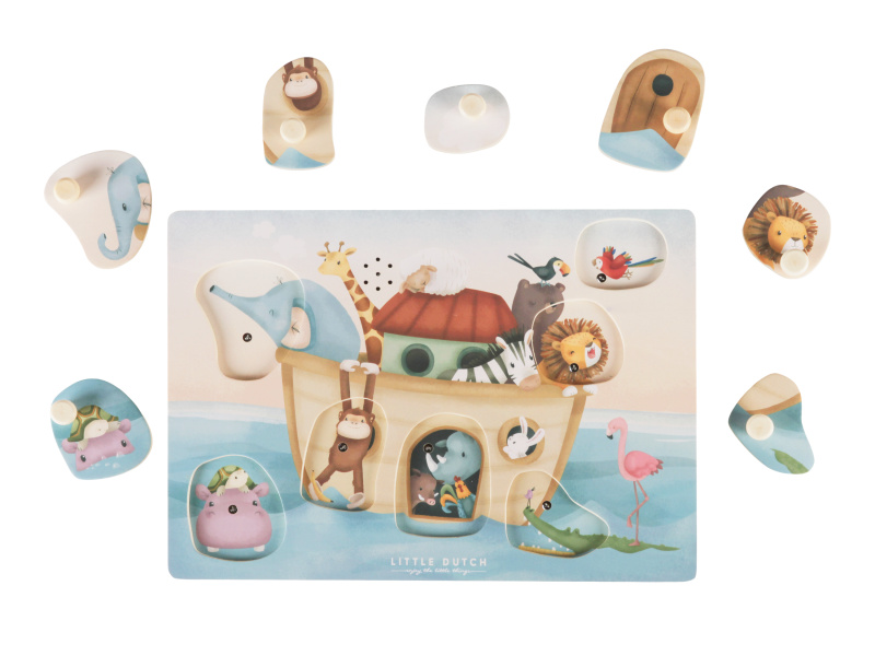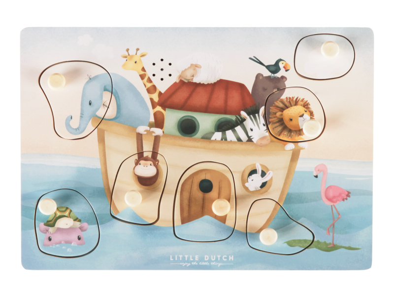 Poznávejte spolu s vaším dítětem, která zvířata plují na Noemově arše a jaké zvuky vydávají. Když dítě vloží správný tvar do otvoru na herní desce, ozve se např. hlas slona či lva nebo bublání pod hladinou. Puzzle hra v dřevěném provedení s krásnými obrázky nabízí 7 různých vkládacích dílů. Rozměry: 21 x 30 x 2,4 cm Baterie 2xAAA nejsou součástí balení. Vhodné pro děti od 12 měsíců.