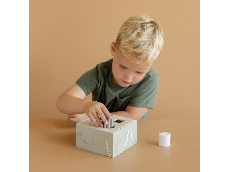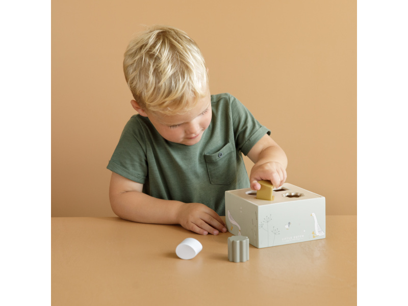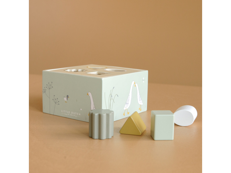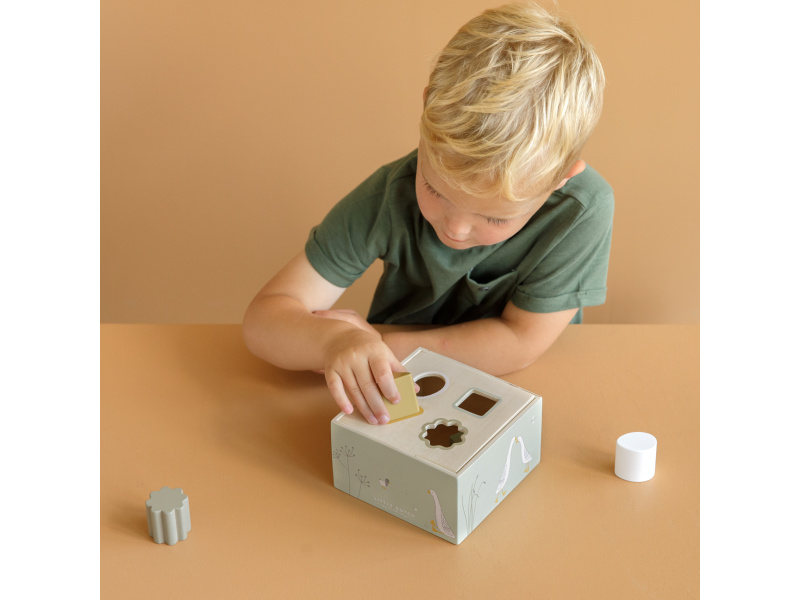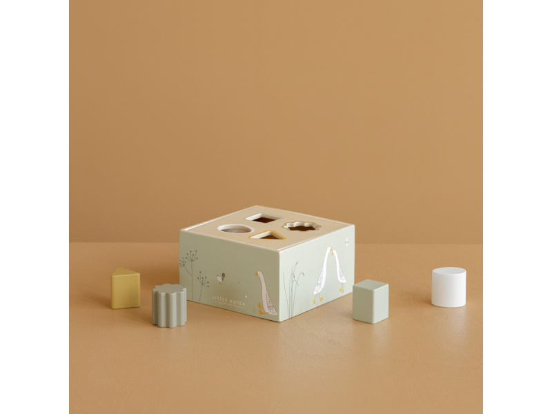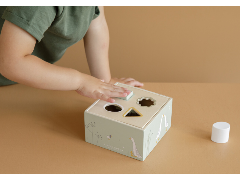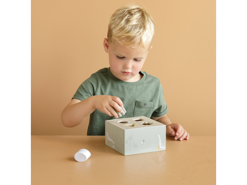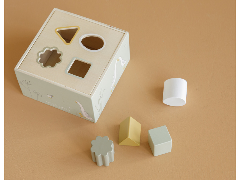 Vkládačka dřevěných tvarů učí děti kreativním zpsůobem rozpoznávat tvary a barvy a zdokonalit svou koordinaci rukou a očí. Malé ručičky snadno uchopí kostky různých tvarů a pak je zatlačí do správného otvoru. Krabička s krásnými ilustracemi ze života husičky je vyrobena z pevného dřeva. Klasická vzdělávací a zároveň zábavná hračka. Rozměry: 12,8 x 12,8 x 12,8 cm Vhodné pro děti od 18 měsíců.