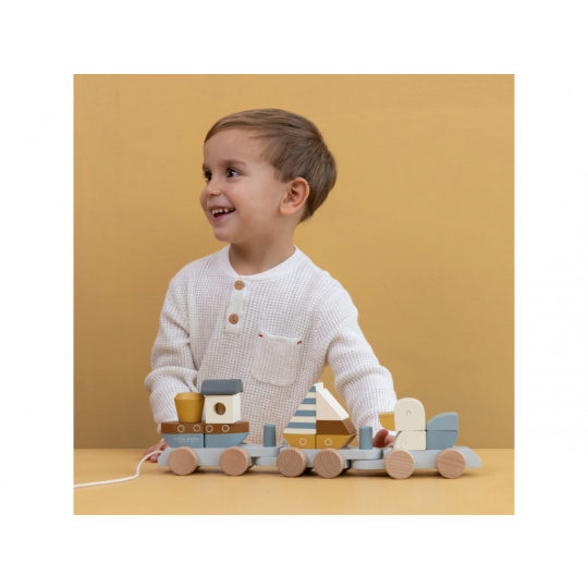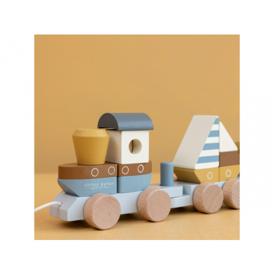 Originální dřevěný vláček z dílny Little Dutch je tvořen kostkami různých barev ve tvaru parníku, plachetnice a racka. Kombinováním kostek si vaše dítě může sestavovat různé varianty vagónů dle své fantazie. Vláček zajistí vašemu dítěti spoustu zábavy a může sloužit i jako krásná dekorace v dětském pokoji. Rozměry: 38,2 x 7 x 10,6 cm Vhodné pro děti od 18 měsíců.