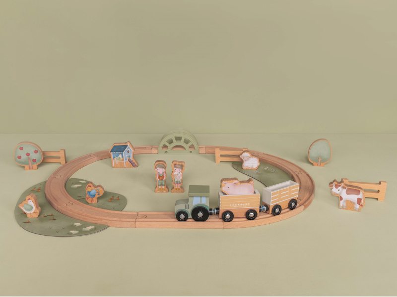 Oblíbená vláčkodráha v krásném dřevěném provedení nabízí vašemu dítěti nekonečné hodiny zábavy a pomáhá rozvíjet jeho kreativitu i jemnou motoriku. Sada obsahuje 10 dílů kolejí, mašinku se dvěma vagóny a 13 dalších doplňků ze života na farmě. Farma, postavičky, zvířátka i stromy jsou oboustranně potištěné. Zvířátka mají velikost vhodnou pro naložení do vagónů, aby mohla vyrazit na výlet vlakem. Hračka je součástí designové kolekce hraček a doplňků Little Dutch Farma. Vyrobeno z dřeva certifikovaného FSC. Rozměry složených kolejí: 60 x 40 cm Vhodné pro děti od 18 měsíců.