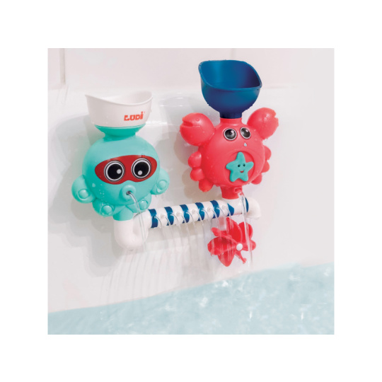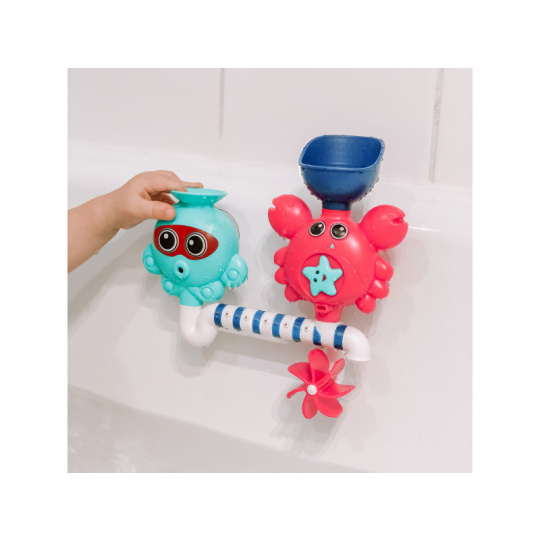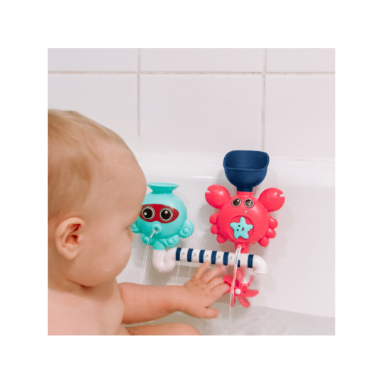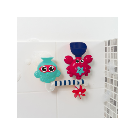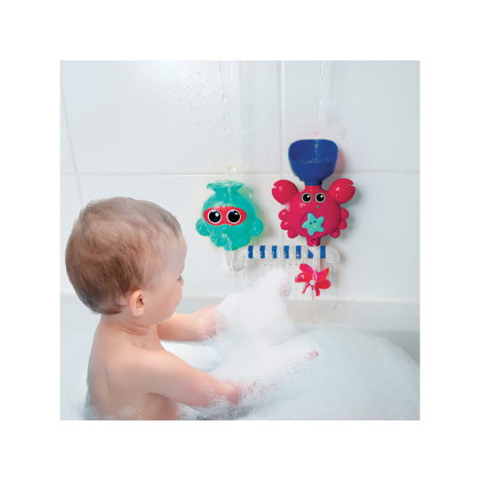 Veselá a zábavná hračka do koupele bude bavit vaše dítě i vás! Pozorujte spolu, co se stane, když do trychtýřů nalijete vodu a ta začne stříkat různými otvory v potrubí a zároveň roztáčet vodní mlýnek! Dítě se během hry s vodou učí rozumět příčině a následku, rozvíjet své pozorovací schopnosti i svou obratnost. Hračka se snadno připevní na vanu či dlaždice s pomocí přísavek. Rozměry: 21,5 x 22,5 x 6 cm Složení: ABS Vhodné pro děti od 10 měsíců.