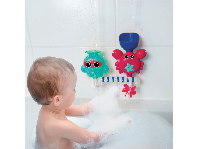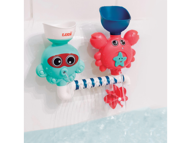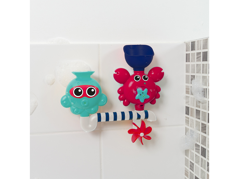 Veselá a zábavná hračka do koupele bude bavit vaše dítě i vás! Pozorujte spolu, co se stane, když do trychtýřů nalijete vodu a ta začne stříkat různými otvory v potrubí a zároveň roztáčet vodní mlýnek! Dítě se během hry s vodou učí rozumět příčině a následku, rozvíjet své pozorovací schopnosti i svou obratnost. Hračka se snadno připevní na vanu či dlaždice s pomocí přísavek. Rozměry: 21,5 x 22,5 x 6 cm Složení: ABS Vhodné pro děti od 10 měsíců.