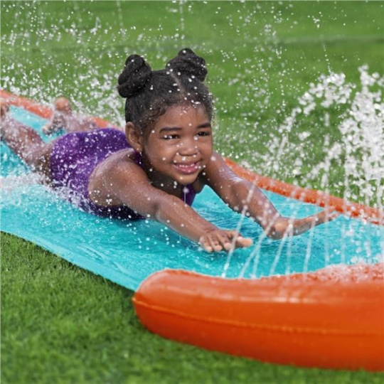 Jednoduchá skluzavka StompBlast je skvělá pro letní zábavu na zahradě. Ideální pro děti od 3 let, tato skluzavka s jedním pruhem má spršky, které se aktivují na požádání, když děti šlápnou na podložku StompBlast™, aby postříkaly kamarády při závodu do cíle. Vestavěné spršky SplashBoost pokrývají celou délku skluzavky a zajišťují cílené zvlhčení pro maximální kluzkost, stříkání a šplíchání.