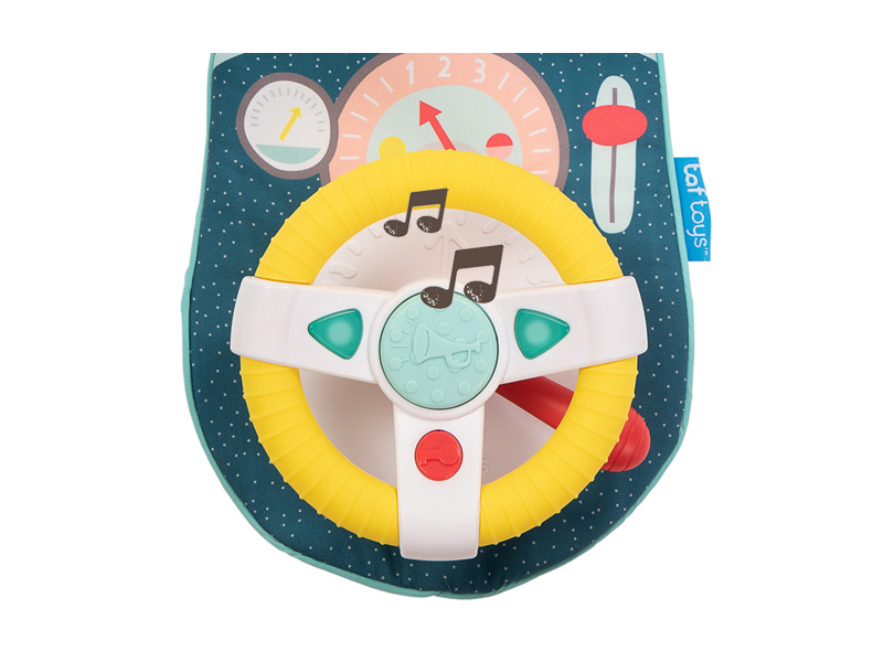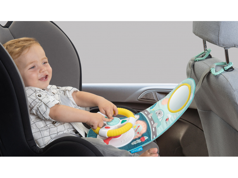 Ideální hračka pro malé řidiče do auta! Otáčení volantu a řadicí páky a mačkání tlačítek pomáhá vývoji jemné i hrubé motoriky dítěte. Světla a zvuky stimulují rozvoj smyslů dítěte. Hra na opravdové řízení podporuje dětskou představivost. Hrací pultík s volantem snadno zavěsíte za opěrku hlavy před dítě sedící v autosedačce po směru jízdy. Baterie 2xAA nejsou součástí. Vhodné pro děti od 12 měsíců.