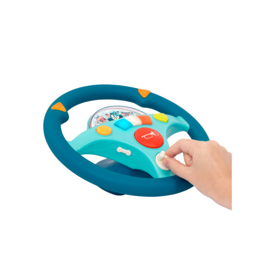 Interaktivní volant pro malého řidiče je ideální hračkou do autosedačky. Malý řidič může otáčením volantu pouštět blinkry. K řízení si může pustit písničku. Volant vydává i zvuky motoru a je vybaven houkačkou. Pod průhledným krytem je malé autíčko a pohybující se ulice města, autíčko ulicí jede dopředu nebo couvá. Baterie 3xAAA jsou součástí. Vhodné pro děti od 2 let.