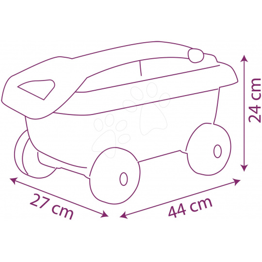 Celkové rozměry vozíku jsou 44*27*24 cm, rukojeť na tahání je přizpůsobena malým dětským ručkám. Francouzský výrobce Smoby přináší dětem kvalitní hračky již celá desetiletí. Hračky Smoby mají pestré barvy a proto podněcují dětskou fantazii a představivost, pomáhají jim rozvíjet jemnou motoriku a sebevědomí. Mají také oblé hrany, které chrání děti před zraněním. Plast na hračkách Smoby je sametový na dotek, jsou zárukou francouzské kvality, bezpečnosti a originality.