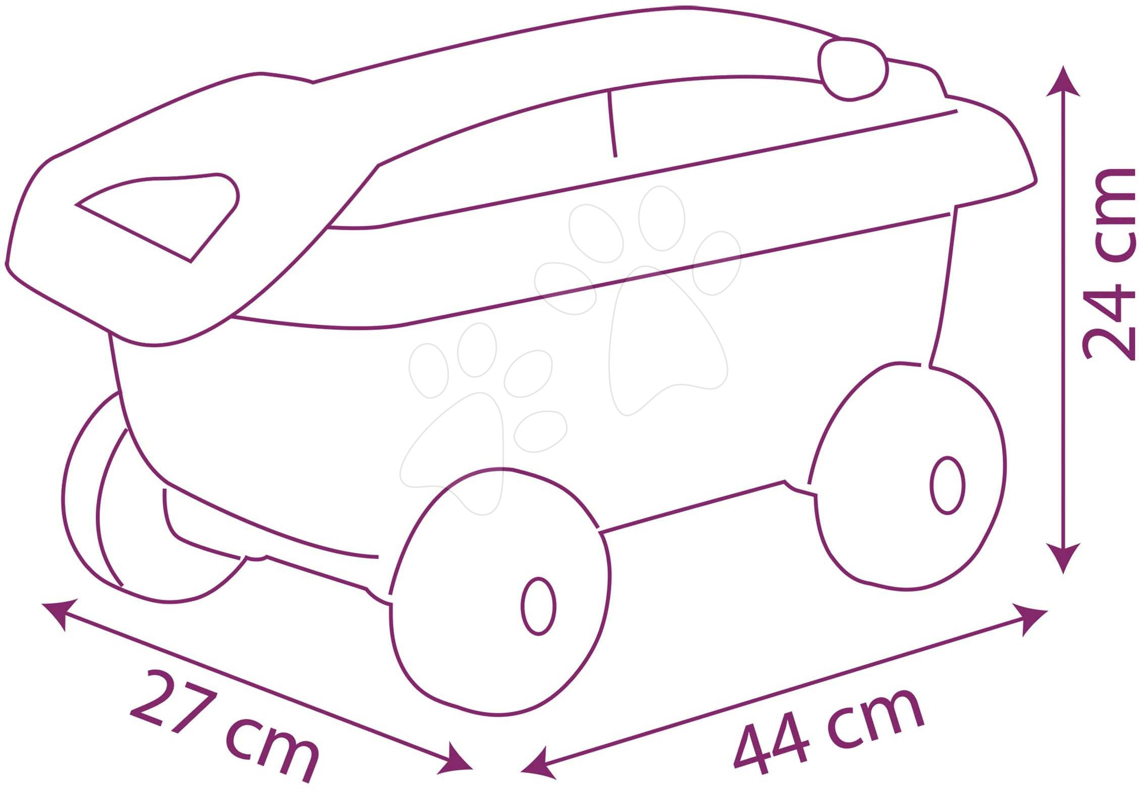 Celkové rozměry vozíku jsou 44*27*24 cm, rukojeť na tahání je přizpůsobena malým dětským ručkám. Francouzský výrobce Smoby přináší dětem kvalitní hračky již celá desetiletí. Hračky Smoby mají pestré barvy a proto podněcují dětskou fantazii a představivost, pomáhají jim rozvíjet jemnou motoriku a sebevědomí. Mají také oblé hrany, které chrání děti před zraněním. Plast na hračkách Smoby je sametový na dotek, jsou zárukou francouzské kvality, bezpečnosti a originality.