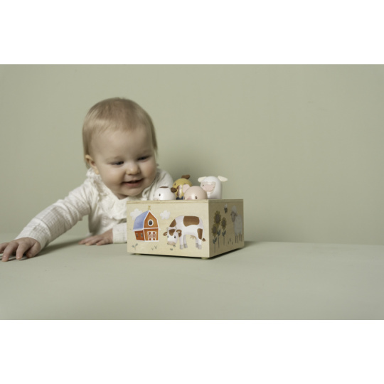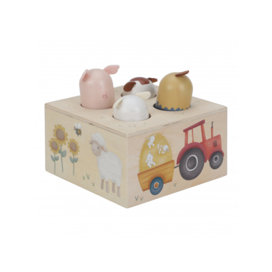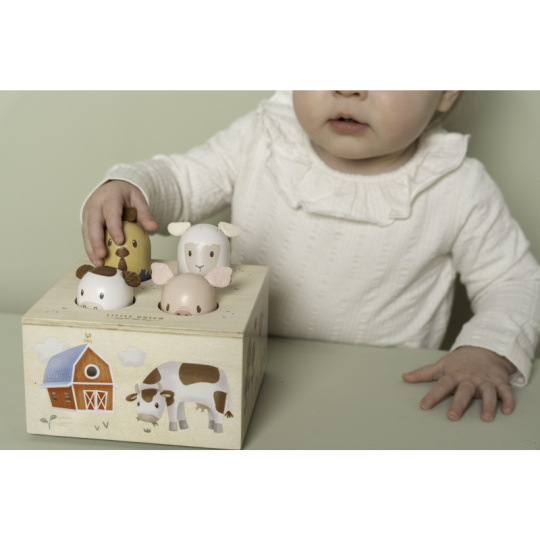 Zábavná a originální hračka se zvířátky z farmy bude bavit děti i vás! Zatlačením na hlavičku zvířátka jedno zasunute a druhé vyskočí, zároveň uslyšíte zvuky, které prasátko, ovečka, kravička a slepička vydávají. Hračka v krásném dřevěném provedení pomáhá hravým způsobem rozvíjet představivost a kognitivní schopnosti dítěte. Hračka je součástí designové kolekce hraček a doplňků Little Dutch Farma, inspirované životem na farmě. Rozměry: 14 x 12,5 x 14 cm Vhodné pro děti od 12 měsíců.