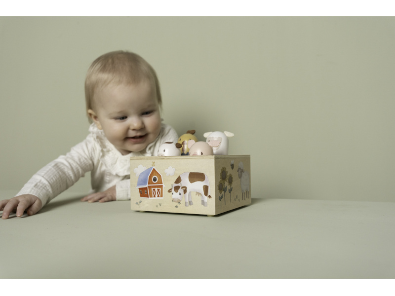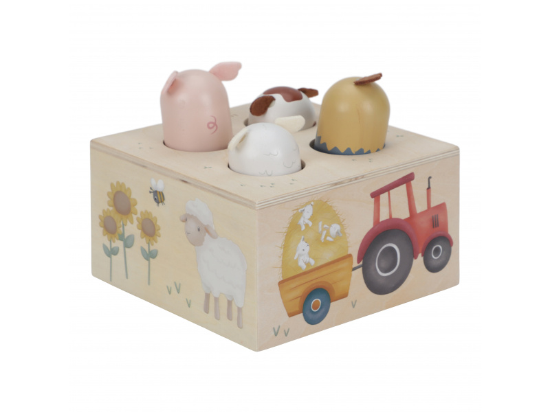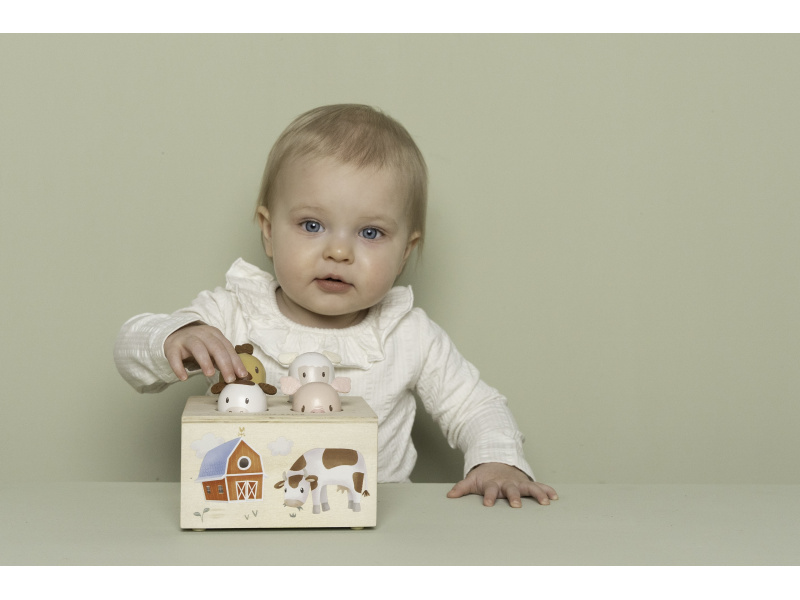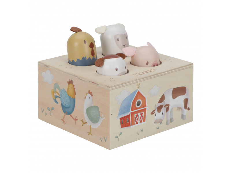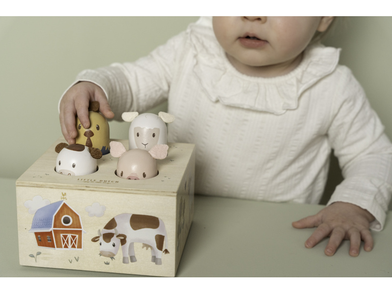 Zábavná a originální hračka se zvířátky z farmy bude bavit děti i vás! Zatlačením na hlavičku zvířátka jedno zasunute a druhé vyskočí, zároveň uslyšíte zvuky, které prasátko, ovečka, kravička a slepička vydávají. Hračka v krásném dřevěném provedení pomáhá hravým způsobem rozvíjet představivost a kognitivní schopnosti dítěte. Hračka je součástí designové kolekce hraček a doplňků Little Dutch Farma, inspirované životem na farmě. Rozměry: 14 x 12,5 x 14 cm Vhodné pro děti od 12 měsíců.