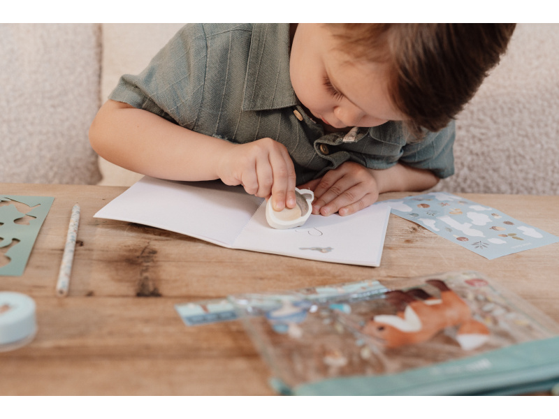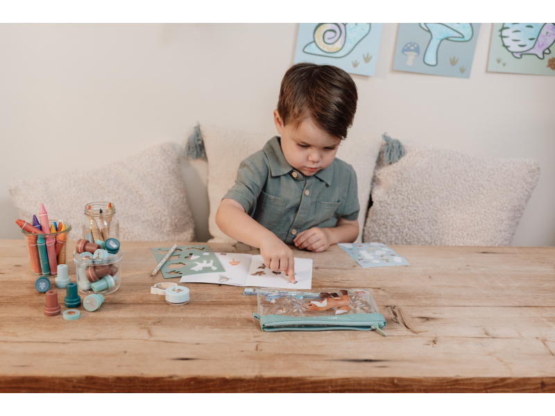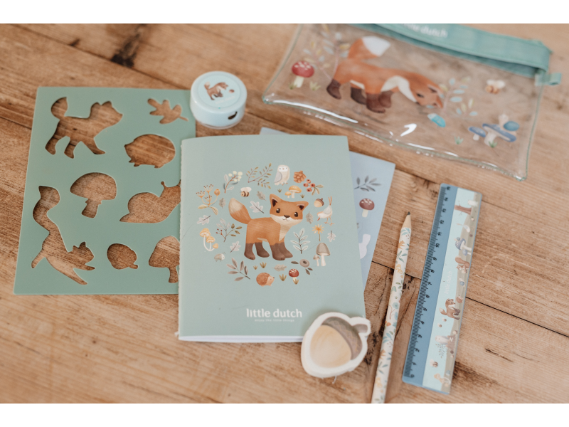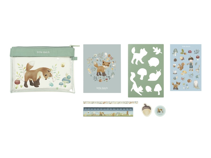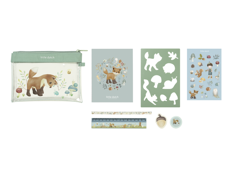 Sada výtvarných potřeb v krásném provedení s motivy života v lese obsahuje průhledné pouzdro na zip, sešit, samolepky, pravítko, gumu, ořezávátko a šablony. Sada je součástí designové kolekce hraček a doplňků Little Dutch Forest Friends inspirované životem v lese. Vhodné pro děti od 3 let.