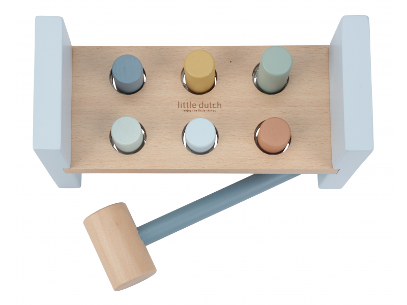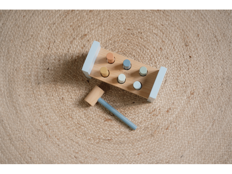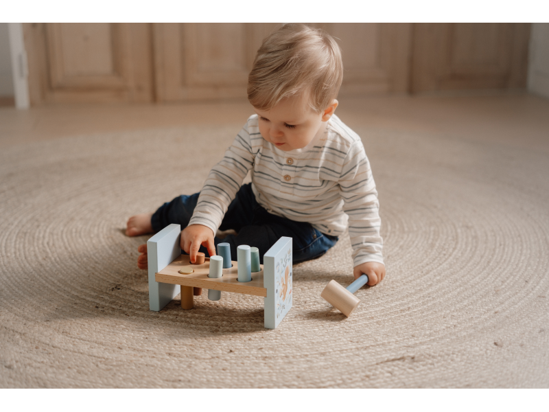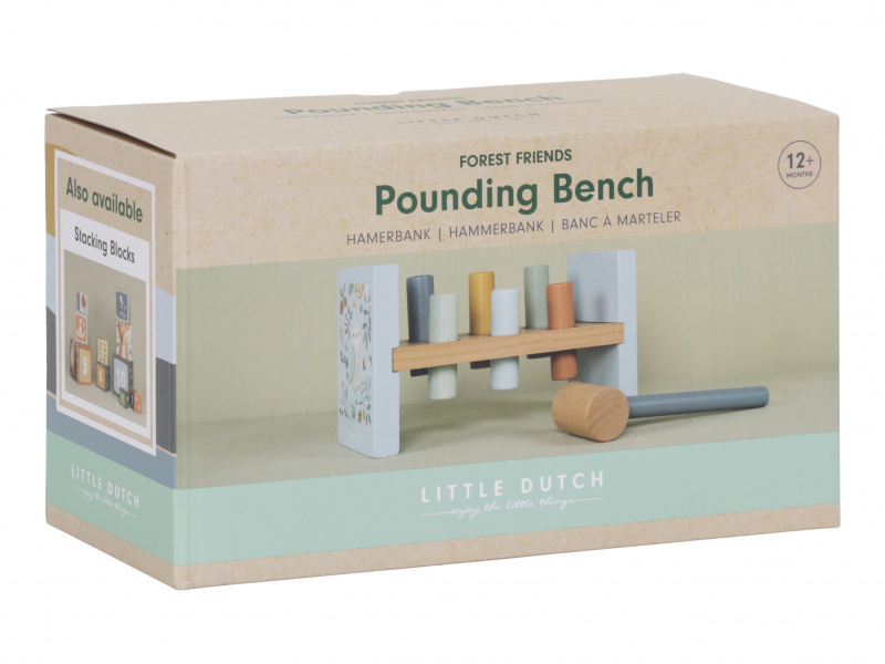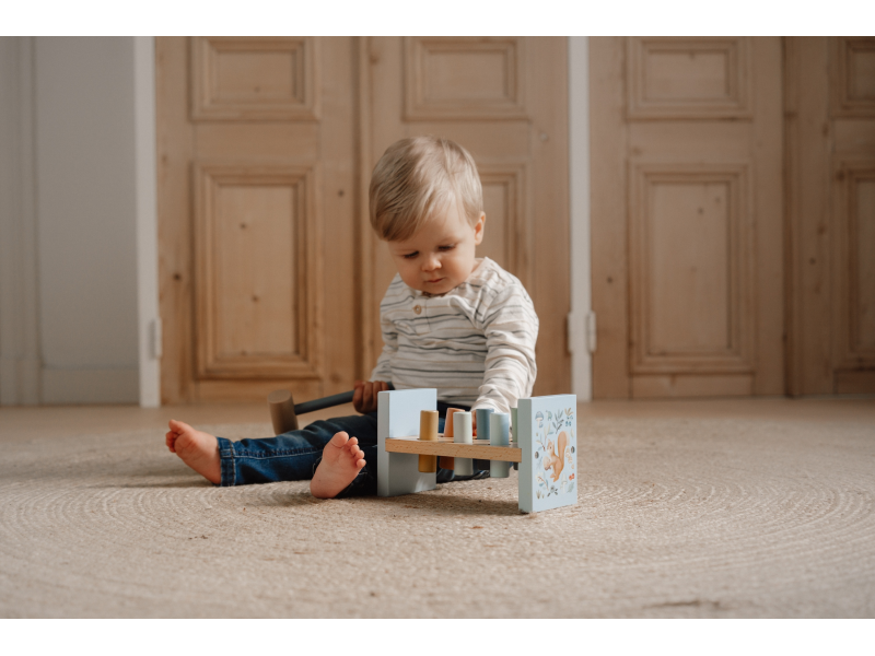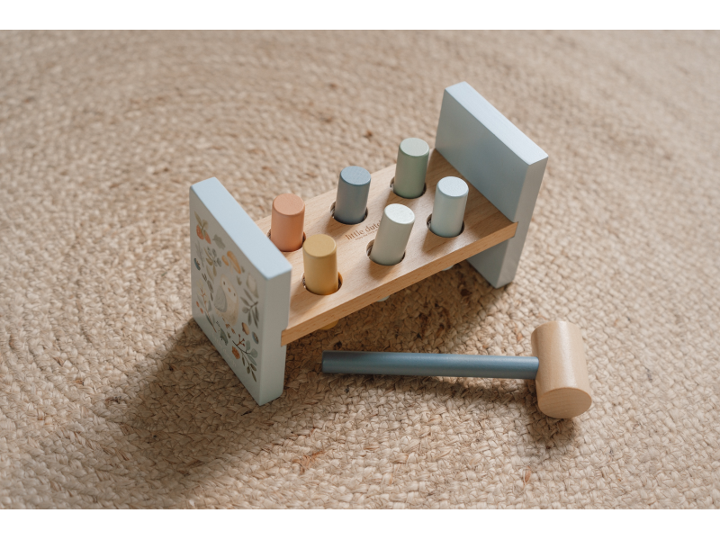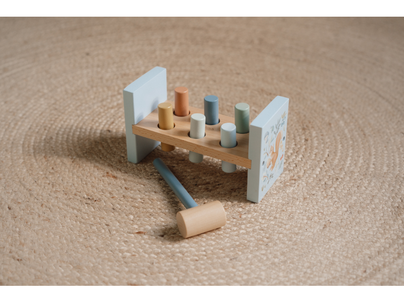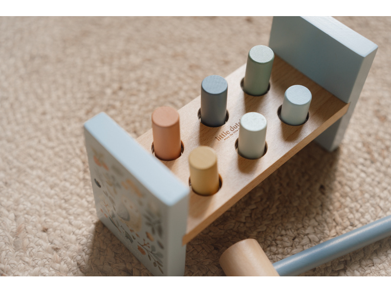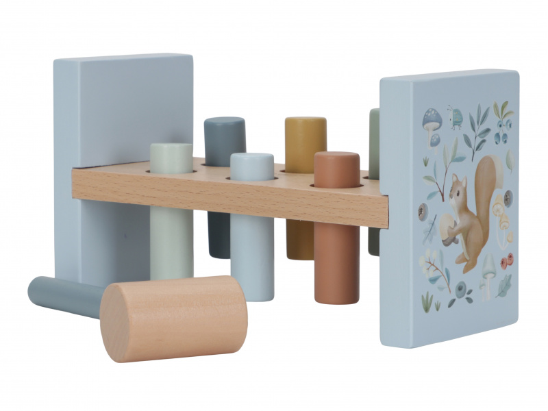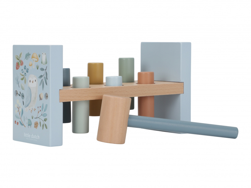 Klep sem, klep tam! Trefí vaše dítě všechny kolíčky? Pomocí kladiva je potřeba zatlouct 6 barevných kolíků do dřevěného stojanu. Až se to podaří, stačí stojan otočit a začít znovu! Můžete zatloukat pořád dokola! Hračka pomáhá rozvíjet jemnou motoriku vašeho dítěte. Zatloukačka je součástí designové kolekce hraček a doplňků Little Dutch Forest Friends inspirované životem v lese. Vyrobeno z dřeva certifikovaného FSC. Rozměry: 23 x 16 x 11,5 cm Vhodné pro děti od 12 měsíců.