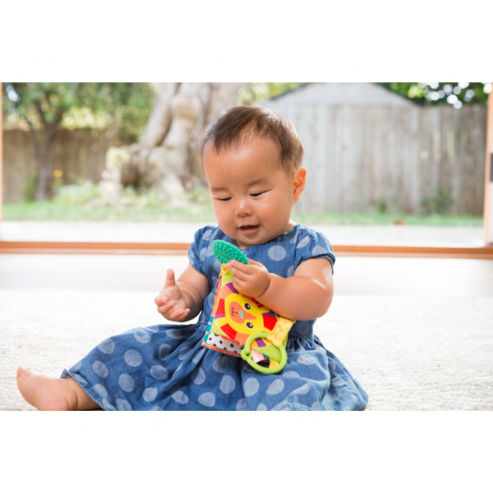 Textilní kniha s výraznými obrázky zvířátek ve vysoce kontrastních barvách pomáhá rozvíjet zrak dítěte. Nabízí dítěti různorodé textury pro zkoumání včetně kousátka, které pomůže dítěti při prořezávání prvních zoubků. Knížku je možné zavěsit např. na autosedačku. Knížka vám usnadní vymýšlení příběhů pro vaše dítě a podporuje tak komunikaci s dítětem, důležitou pro jeho další vývoj. Vhodné od narození.