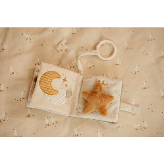Měkká textilní knížka s krásnými motivy ze života husičky a králíčka upoutá pozornost vašeho dítěte množstvím aktivit, ukrytých na jednotlivých stránkách. Ke zkoumání a prohlížení lákají šusticí i pískací stránky, různorodé textury nebo např. bezpečné zrcátko. Knížka pomáhá rozvíjet jednotlivé smysly dítěte i koordinaci ruka / oko. Knížku můžete snadno zavěsit na kočárek, autosedačku či postýlku. Knížka je součástí designové kolekce hraček Little Dutch Newborn Naturals. Rozměry: 11 x 11 x 3 cm Složení: 100% polyester Výplň je vyrobena ze 100% recyklovaného polyesteru s certifikací GRS (Global Recycled Standard). Možno prát v pračce na jemný program při 30°C. Vhodné od narození.