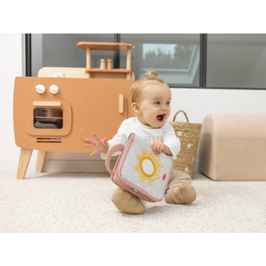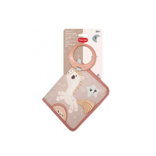 Textilní závěsná knížka Tiny Love Unicorn Wonderlands s pohádkovým motivem jednorožce nabízí miminku pestrý svět smyslového objevování. Je navržena tak, aby přirozeně rozvíjela dětské dovednosti už od narození. Různé textury, kontrastní tvary a hravé detaily podporují zrakové vnímání, jemnou motoriku i první pokusy o komunikaci. V knížce najdete jednorožce s šustivým ocasem, bezpečné zrcátko ve tvaru sluníčka, hvězdičku s texturami, plyšový obláček, pískací měsíc, šusticí duhu se schovávačkou i barevné saténové stužky. Knížka je ideální na doma i na cesty – snadno ji s pomocí závěsného kroužku připevníte ke kočárku, autosedačce nebo hrazdě na hrací dece. Rozměry: 15 × 17,8 × 3 cm Vhodné pro děti od narození.