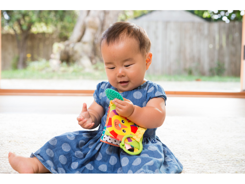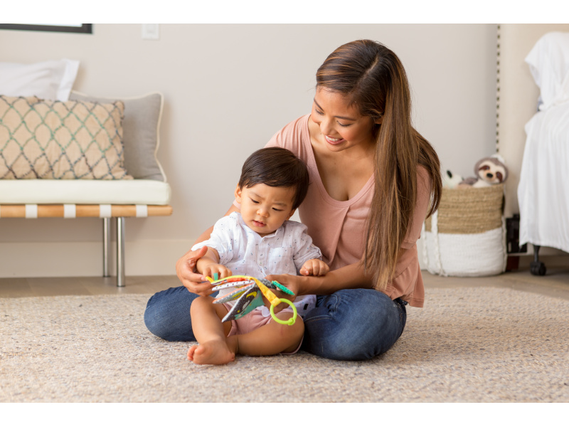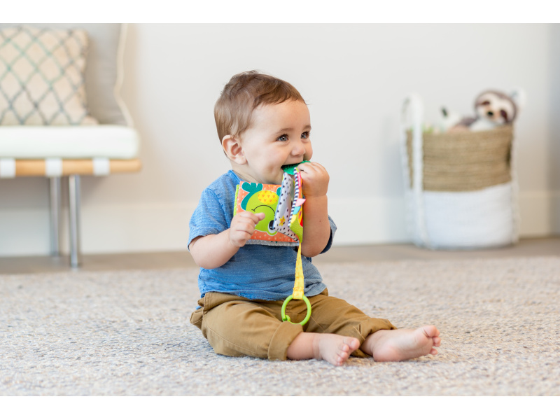Textilní kniha s výraznými obrázky zvířátek ve vysoce kontrastních barvách pomáhá rozvíjet zrak dítěte. Nabízí dítěti různorodé textury pro zkoumání včetně kousátka, které pomůže dítěti při prořezávání prvních zoubků. Knížku je možné zavěsit např. na autosedačku. Knížka vám usnadní vymýšlení příběhů pro vaše dítě a podporuje tak komunikaci s dítětem, důležitou pro jeho další vývoj. Vhodné od narození.