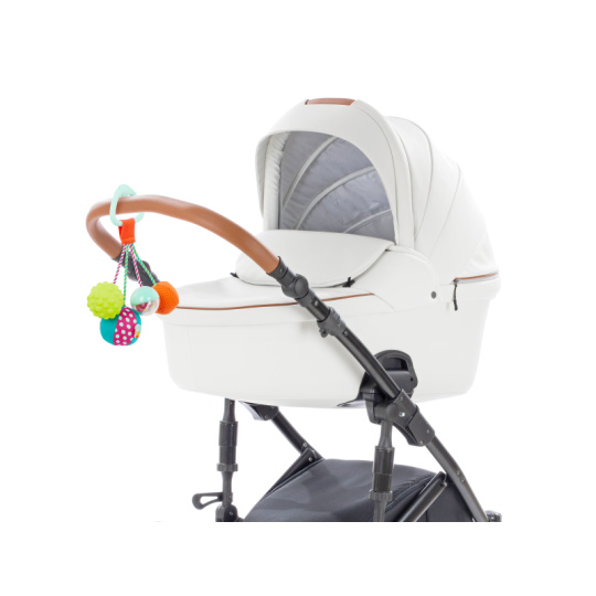 Závěsné chrastítko s míčky ve výrazných kontrastních barvách nabízí různorodé textury i zvuky - jednotlivé míčky cinkají, chrastí, pískají i šustí. Závěsný kroužek slouží i jako kousátko. Hračka láká dítě ke zkoumání a pomáhá rozvíjet jednotlivé smysly dítěte. Vhodné pro děti od 3 měsíců.