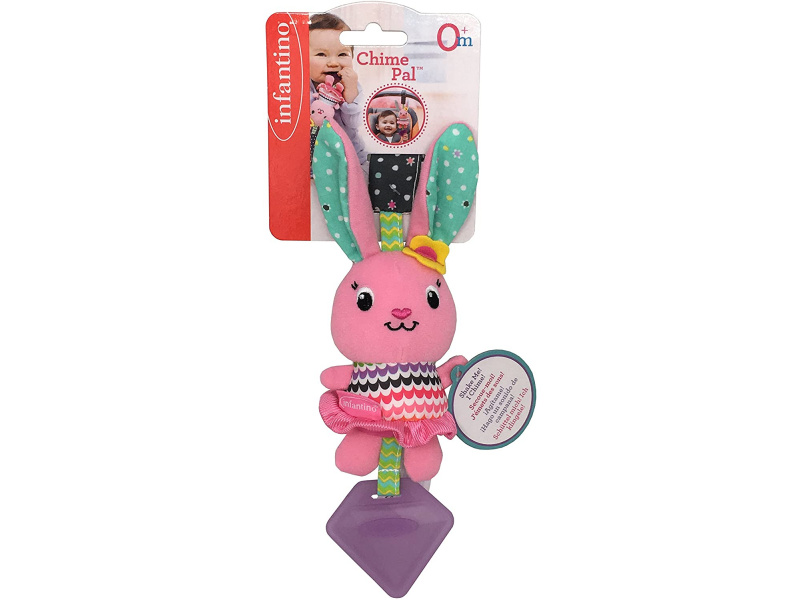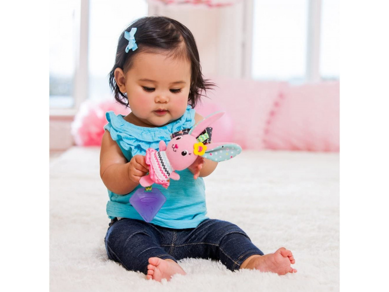 Růžový králíček nabízí různorodé textury ke zkoumání a kousátko, které pomáhá dítěti při prořezávání prvních zoubků. Při pohybu jemně cinká. Hračku je možné zavěsit na autosedačku, kočárek či hrazdu na hrací dece. Vhodné pro děti od narození.