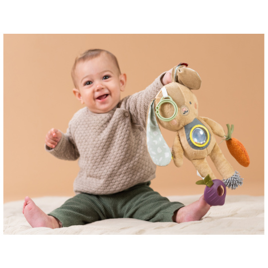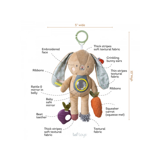 Hračka v podobě roztomilého králíčka Jenny se snadno zavěsí na postýlku, kočárek, autosedačku apod. Hračka chrastí, šustí a nabízí různorodé textury i kousátko pro zkoumání rukama i ústy dítěte. Rozvíjí jemnou motoriku a smysly dítěte. Hračky Taf Toys jsou navrženy tak, aby rozvíjely emoční inteligenci dítěte, která je nezbytným klíčem ke zdravé osobnosti a sebedůvěře dítěte. Rozměry: 25 x 13 x 10 cm Vhodné pro děti od narození.