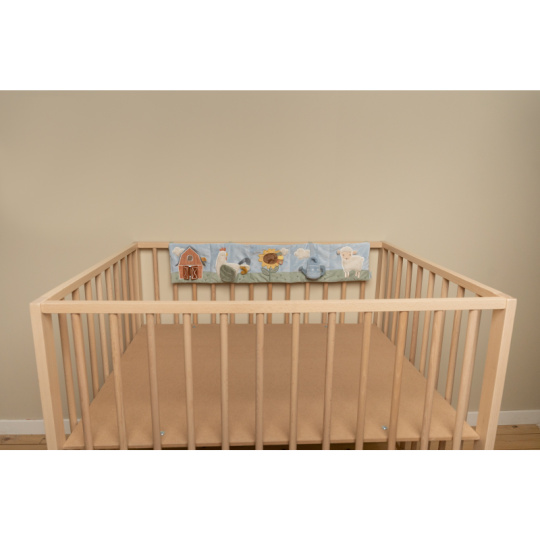Měkký textilní mantinel s krásnými motivy ze života na farmě upoutá pozornost vašeho dítěte množstvím aktivit ke zkoumání a prohlížení. Nabízí různorodé textury, chrastítko, kousátko i bezpečné zrcátko. Při umístění před dítě ležící na bříšku podněcuje dítě ke zvedání hlavičky. Aktivity na mantinelu pomáhají rozvíjet jednotlivé smysly dítěte i koordinaci ruka / oko. Mantinel můžete snadno zavěsit na postýlku či hrací ohrádku. Hračka je součástí designové kolekce hraček Little Dutch Farma. Rozměry: 75 x 15 x 6 cm Vhodné od narození.