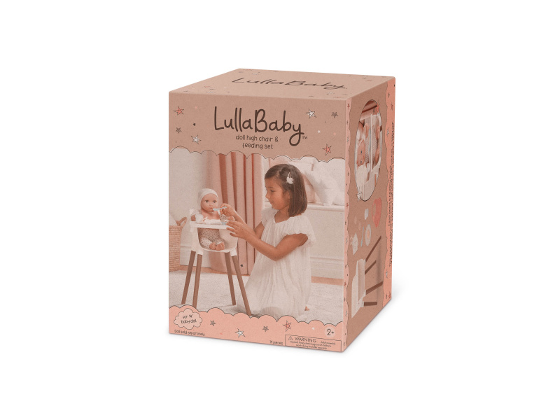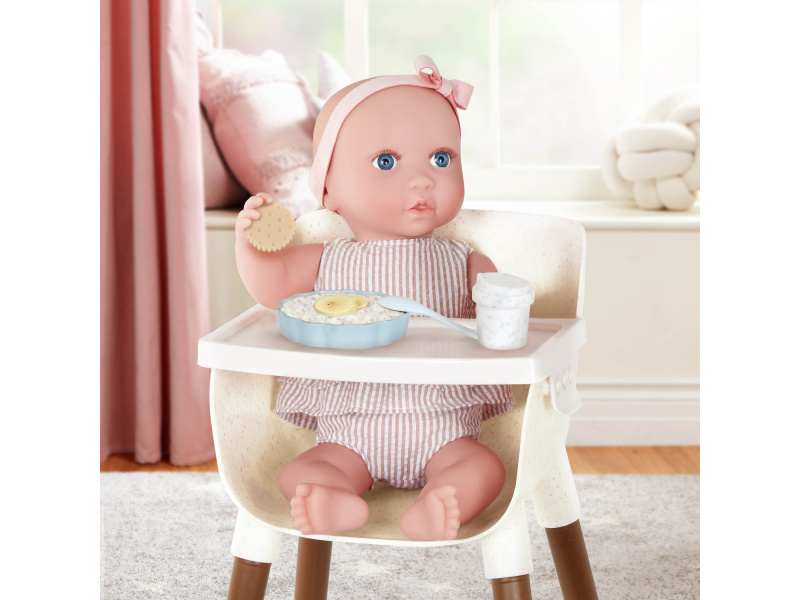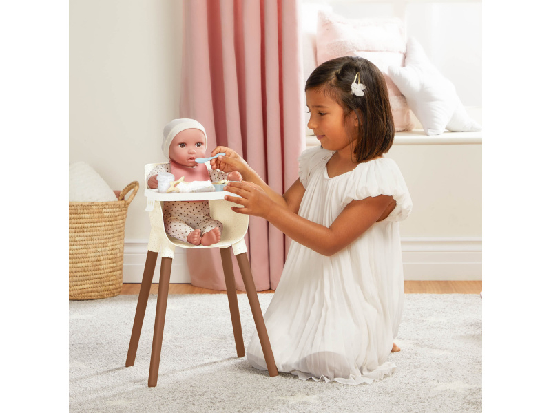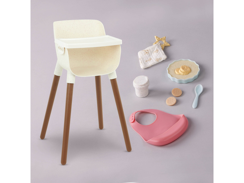 Stylová židlička s jídelním pultem umožní vašim dětem pohodlně usadit svou panenku a nakrmit ji pomocí bohaté sady doplňků, která obsahuje hrneček s odnímatelným víčkem, 2 sušenky, lžičku, misku ovesné kaše s banány, bryndáček a kousátko. Židlička se snadno sestavuje, stačí zasunout nohy a připevnit jídelní pult. Vhodné pro většinu panenek velikosti 35 cm. Panenka není součástí balení. Rozměry: 47 x 25 x 29 cm Vhodné pro děti od 2 let.