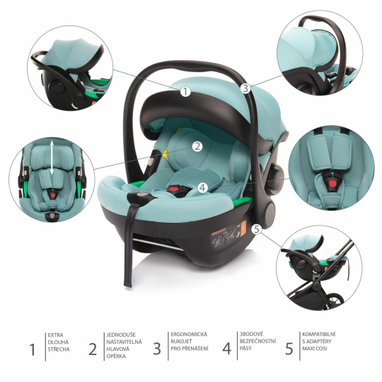 Extra dlouhá stříška je nezávislá od rukojeti, díky tomu můžete používat rukojeť k přenášení autosedačky i bez zatažené stříšky, či naopak. Stříška chrání dítě proti ostrému sluníčku, větru případnému menšímu dešti. Ergonomická rukojeť byla navržena tak, aby co nejvíce usnadnila přenášení. 3 bodové bezpečnostní pásy vám usnadní upínání dítěte do autosedačky a jednoduše nastavitelná hlavová opěrka dopomůže k snadnému nastavení pohodlí pro vaše děťátko, přičemž se takto přizpůsobí tomu, jak dítě roste. Navíc s nastavováním opěrky hlavy rovnou nastavujete i výšku pásů. Pro maximální pohodlí je hlavová opěrka vyplněná paměťovou pěnou. V zadní části autosedačky je praktické odvětrávání. Pro komfort novorozených miminek přichází autosedačka XM s kvalitní novorozeneckou vložkou s použitím až do 75 cm výšky dítěte.