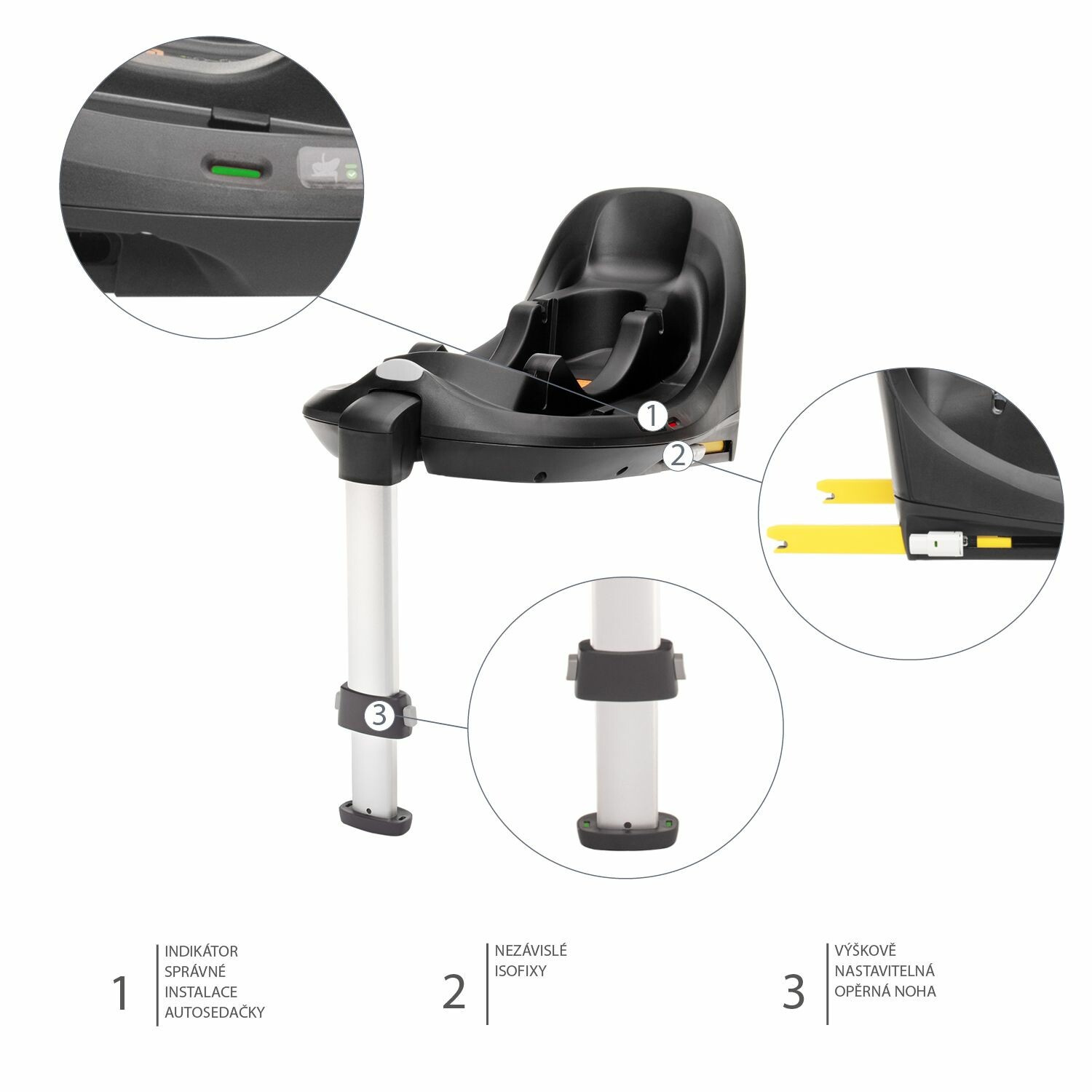 Nezávislé ISOFIX s indikátory pro snadnou a bezpečnou instalaci autosedačky do vozidla. Autosedačka disponuje opěrnou nohou, která přidává další bod pro větší stabilitu i opěrná noha má svůj indikátor správného nastavení. Lepší stabilitu zajistí také bezpečnostní oblouk. Správnou instalaci autosedačky na základnu vám potvrdí indikátory správné instalace. Sejmutí autosedačky ze základny jednoduše přes pojistku.