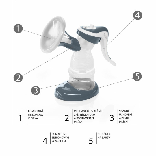 Součástí balení je návod, odsávačka, držák na lahvičku, lahvička, savička, redukce na lahvičku s úzkým hrdlem.