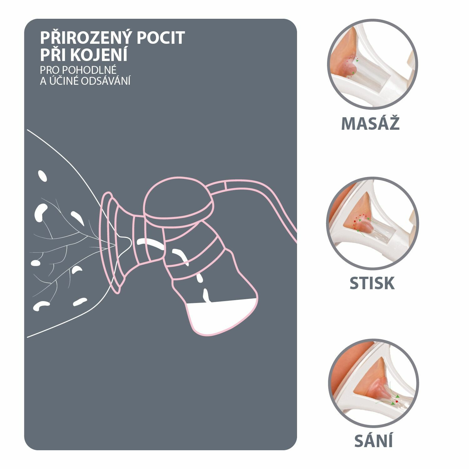 Unikátní technologie, která dokonale napodobuje přirozené sání dítěte. Zaručí maximální efektivitu a bezbolestné odsávání.