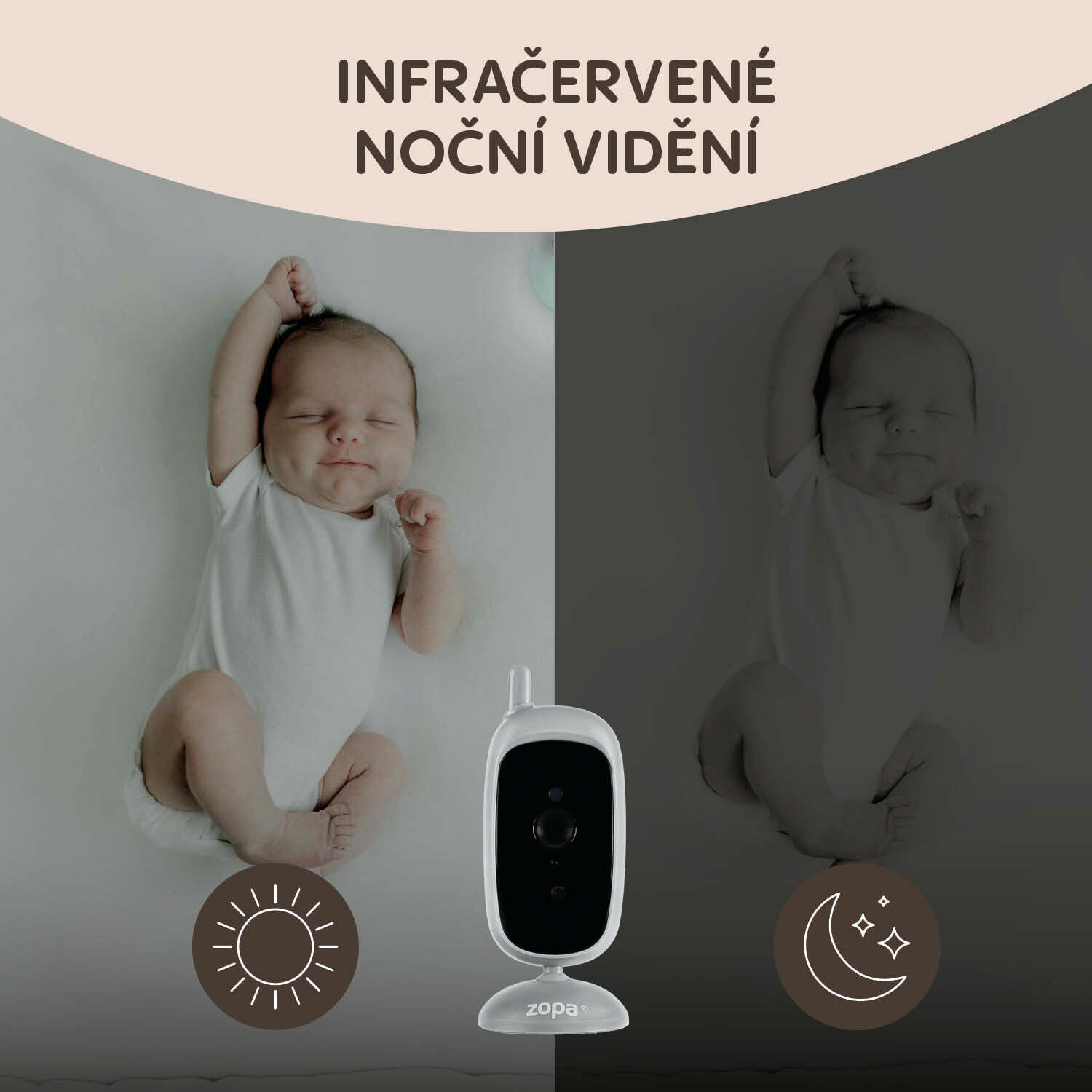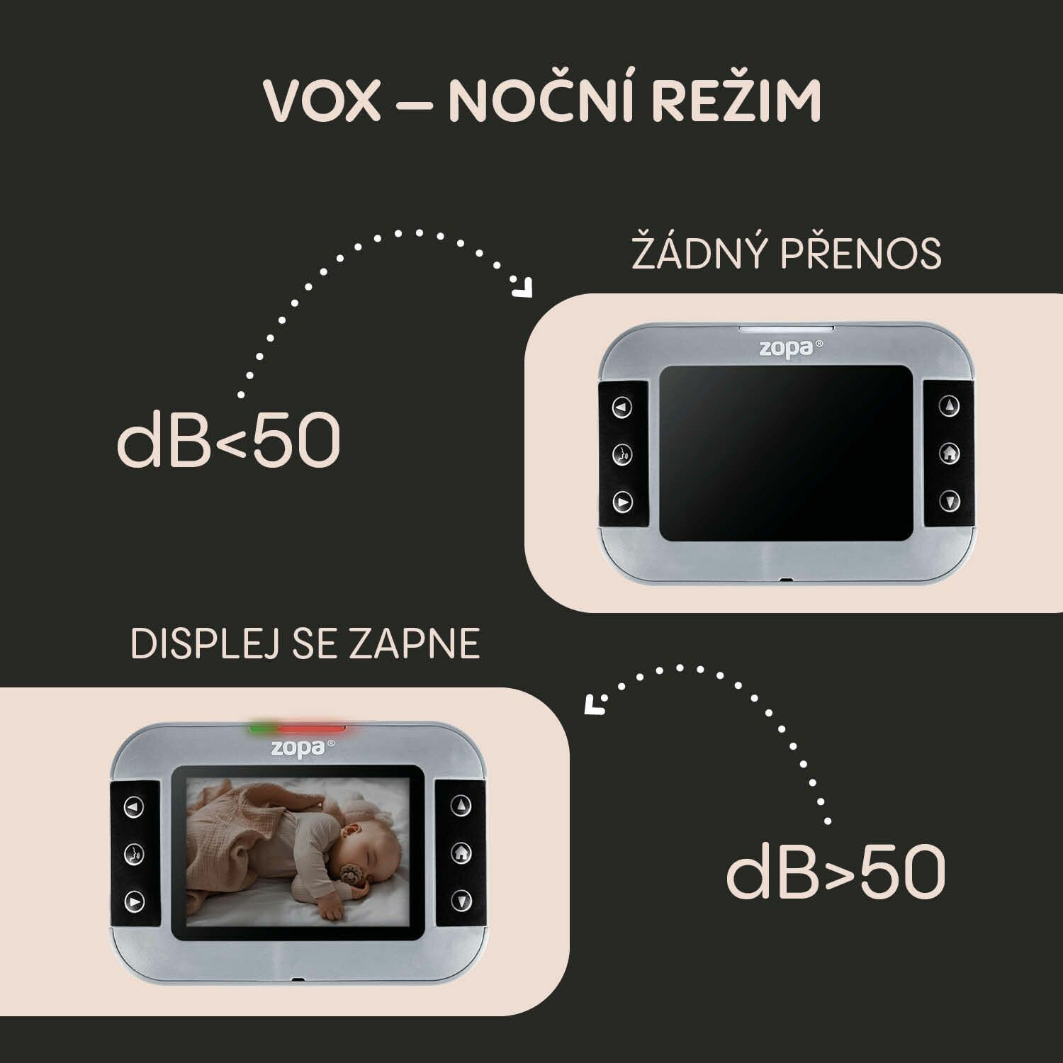 Chůvička Static je plná chytrých vychytávek pro každou situaci. Kdykoliv můžete své děťátko uklidnit na dálku vlastním hlasem nebo pustit uklidňující melodie pro příjemné usínání. Integrovaný teploměr vám pomůže vytvořit ideální podmínky pro spánek – nejen že zobrazuje aktuální teplotu v místnosti, ale také vás upozorní, pokud by byla příliš vysoká. Pro klidné noci oceníte úsporný noční režim, který automaticky vypne přenos zvuku i obrazu, když je v pokoji ticho. Při jakémkoliv zvuku se okamžitě znovu aktivuje.