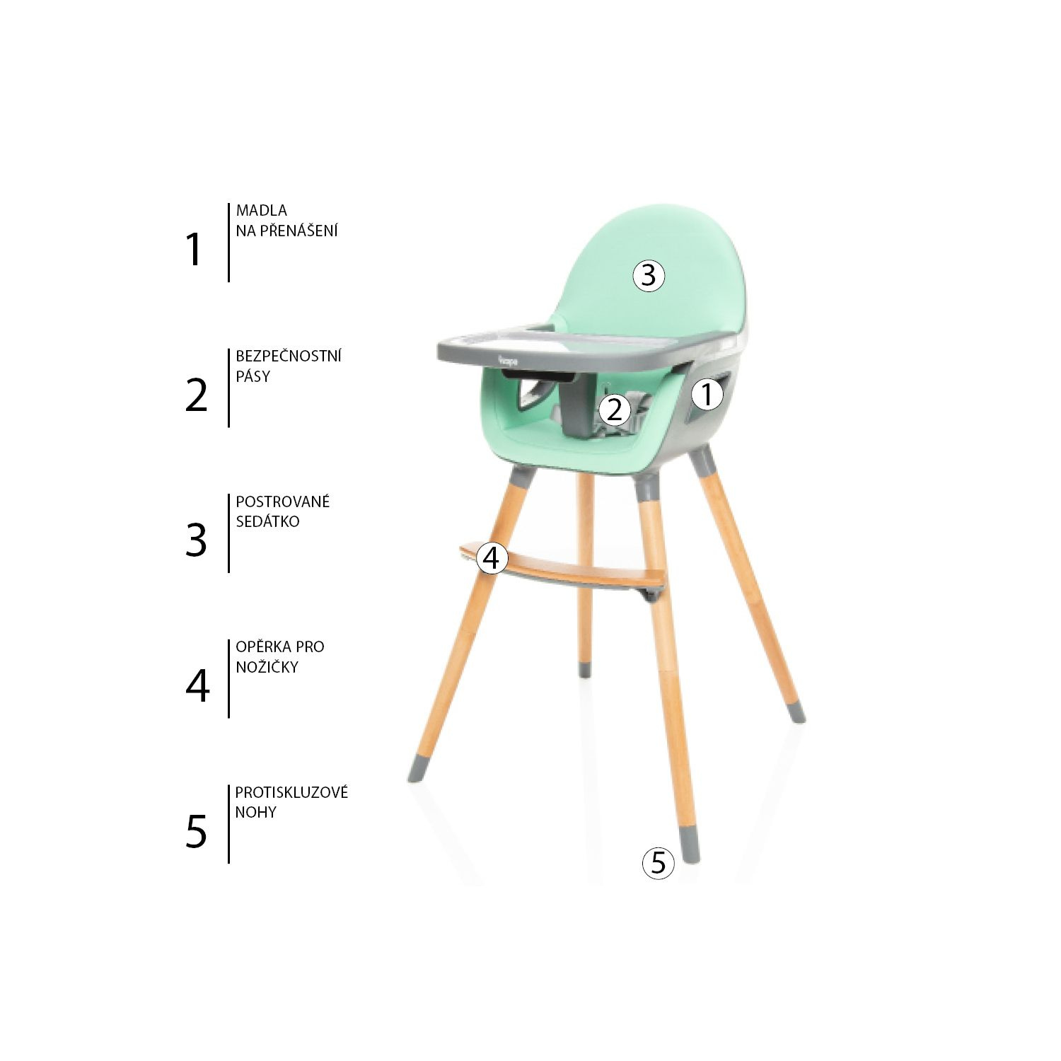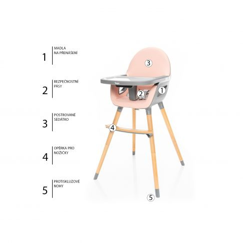Pro co největší bezpečí je židlička vybavena pětibodovými pásy. Můžete tak mít jistotu, že se dítě ani při prudších pohybech nepřevrátí. Dokonalou stabilitu židličky jistí gumová úprava zespodu noh. Jídelní pult je možné nastavit do tří různých vzdáleností podle velikosti dítěte.